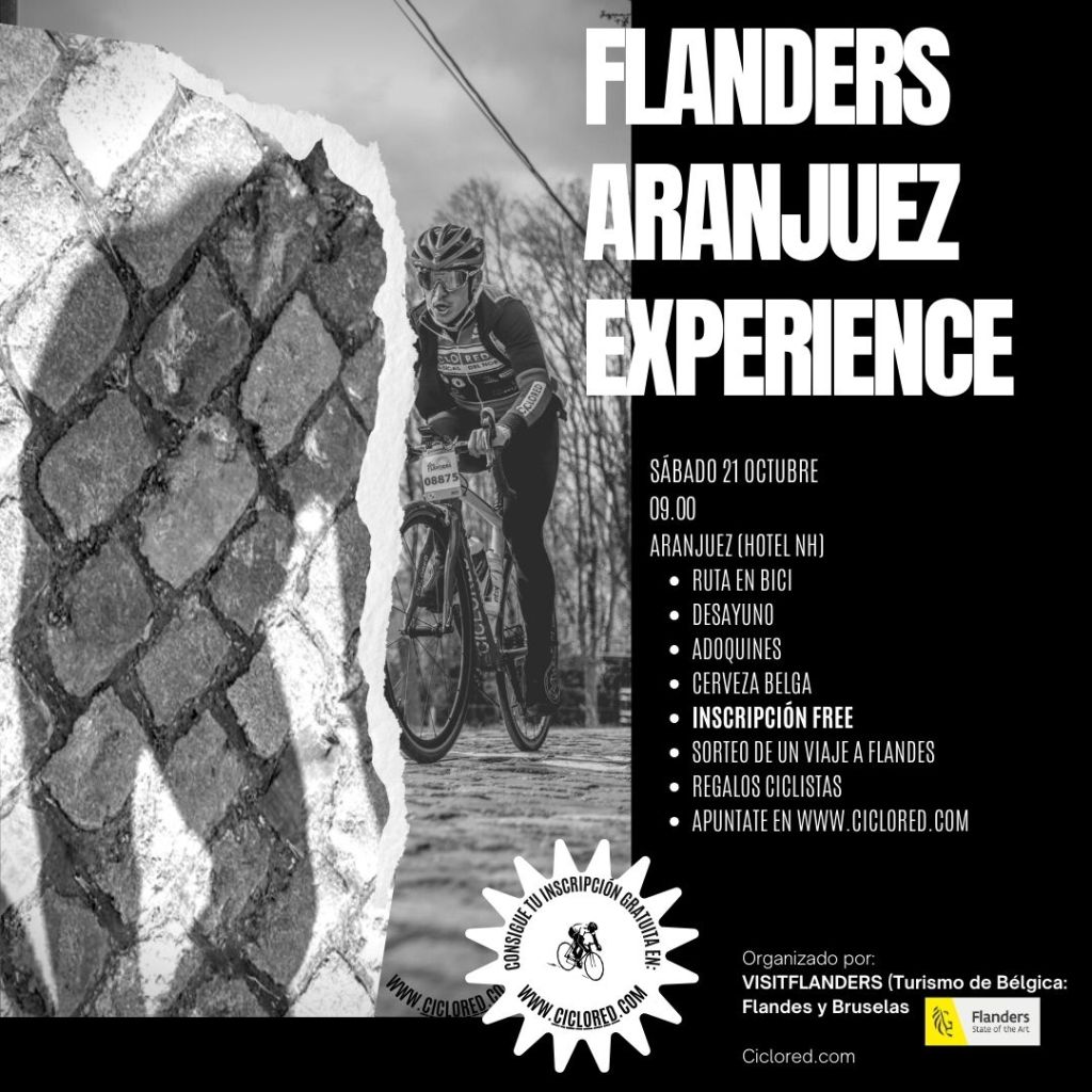 Una treintena de ciclistas van a descubrir este sábado 21 de octubre los ‘sabores de Flandes’. Ciclored.com y VISITFLANDERS (Turismo de Bélgica: Flandes y Bruselas) organizan en Aranjuez la «Flanders-Aranjuez Experience»., con la que pretenden acercar de primera mano la esencia del ciclismo de Flandes a los ciclistas madrileños. Un evento completo con ruta en bici, muros, adoquines, cerveza belga y dos charlas con las que podrán conocer los entresijos del ciclismo flamenco.