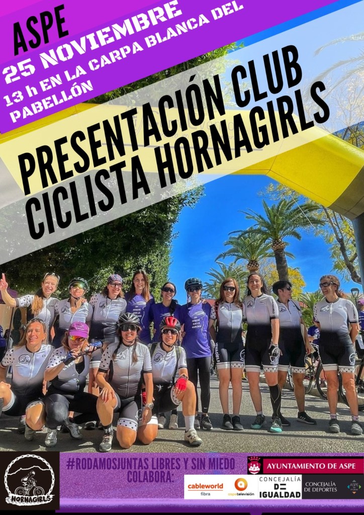 El próximo 25 de noviembre tendrá lugar en Aspe la presentación del Club Ciclista Hornagirls. El acto se desarrollará en la carpa blanca del pabellón dentro de las actividades programadas para el Día Internacional de la Eliminación de la Violencia contra la Mujer que comenzará a las 10 horas con una ruta BTT y que contará con una manifestación a las 12. Está confirmada la asistencia del concejal de Deportes, Daniel Aguilar, y de la edil de Igualdad, Yolanda Moreno, además de la de Clara Santamaría, presidente de la sección de cicloturismo de la FCCV y de la ciclista profesional Marta Romeu. También se ha cursado invitación al alcalde de Aspe, Antonio Puerto, y al presidente de la Federación de Ciclismo de la Comunidad Valenciana, José Enrique Gutiérrez. Una comida, a las 15 horas, con música incluida al final, podrán el broche de oro a una jornada que se presenta con la etiqueta de ser inolvidable.