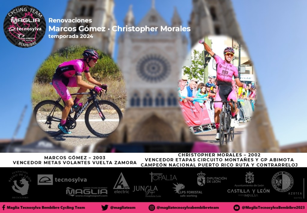 Sigue la ronda de renovaciones para el próximo plantel del de El Bierzo en la próxima temporada de 2024. Madurez, resultados, calidad y sacrificio adjetivos que bien definen a los jóvenes Marcos Gómez y Christopher Morales y la temporada que han fraguado en el Maglia Tecnosylva Bembibre Cycling Team. Marcos Gómez ha protagonizado un sensacional paso adelante en la temporada. Con determinación, fuerza y estrategia ha protagonizado escapadas que han desafiado al pelotón, comandado por los equipos de primera fila; teniéndose que emplear de sobremanera para echar abajo la cabalgada del ciclista burgalés. Además, ciclista esforzado para con el grupo ha sabido poner a disposición del equipo y los compañeros su buen hacer en el pelotón ayudando y aportando por el objetivo grupal. Temporada con letras brillantes la del debut del puertorriqueño Christopher Morales en Europa de la mano del equipo dirigido por Alberto Núñez. El buen trabajo de scooting y seguimiento del equipo leonés se ha materializado en el sensacional rendimiento y resultados de Morales. Victorias derrochando uno de sus potenciales: el golpe de pedal al sprint en una fuga seleccionada le hicieron levantar los brazos y sumar victorias de etapa con el Maglia Tecnosylva Bembibre en el Circuito Montañés y en Portugal en el Gran Premio Abimota, además de protagonizar un sin fin de escapadas que por poco no llegaron a meta. No contento con esto Morales ha hecho «la machada» de ganar por partida doble el campeonato nacional de Puerto Rico, tanto en contrarreloj como en ruta, dejando bien claro que es un valor ciclista emergente que dará mucho de qué hablar sobre la bicicleta. Ambos ciclistas han sido protagonistas de una gran temporada y su trabajo, junto con el sensacional acople grupal que han desarrollado con el resto de compañeros, han sido determinantes para que la Dirección Deportiva de la Fundación Reino de León de Ciclismo haya apostado por renovar la confianza en ellos para la próxima temporada.