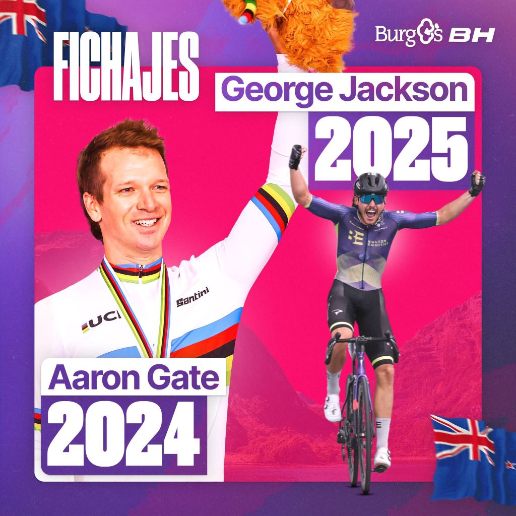 La plantilla del Burgos BH tendrá un importante carácter internacional en 2024 a raíz de la incorporación de los neozelandeses Aaron Gate y George Jackson para la próxima temporada. Gate, quien firma por una temporada, es un consumado especialista en pista, donde ha obtenido numerosos éxitos en Campeonatos del Mundo. En la carretera destaca como un corredor muy polivalente, pudiendo brillar en contrarreloj, en las clásicas o al sprint. Por su parte, Jackson, que correrá hasta 2025 como morado, es un joven sprinter que ha brillado en este final de temporada, logrando cinco triunfos en el circuito asiático. Ambos llegan procedentes del equipo Bolton Equities Black Spoke.