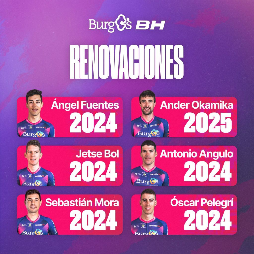 El Burgos BH sigue confeccionando la que será su plantilla en la temporada 2024 y para ello anuncia la renovación del contrato de seis de sus corredores. Ander Okamika ha firmado con el equipo morado hasta 2025, mientras que Jetse Bol, Ángel Fuentes, Antonio Angulo, Óscar Pelegrí y Sebastián Mora seguirán hasta finales de 2024.