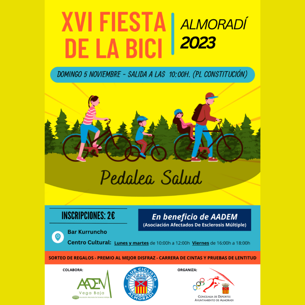 El próximo domingo, día 5 de noviembre, se celebra la XVI Fiesta de la Bici de Almoradí, a partir de las 10 horas. La diversión comenzará en la Plaza de la Constitución. Las inscripciones, que tienen un precio de 2 euros, serán donadas a beneficio de la Asociación Afectados de Esclerosis Múltiple «AADEM Vega Baja». Podrán recoger los dorsales en el bar EL Kurruncho y en el Centro Cultural el viernes de 16 a 18 horas. Al finalizar la vuelta, el Club Ciclista Almoradí, organiza una carrera de cintas y una prueba de lentitud para todos que quieran participar. También habrá sorteo de regalos y un premio al mejor disfraz.