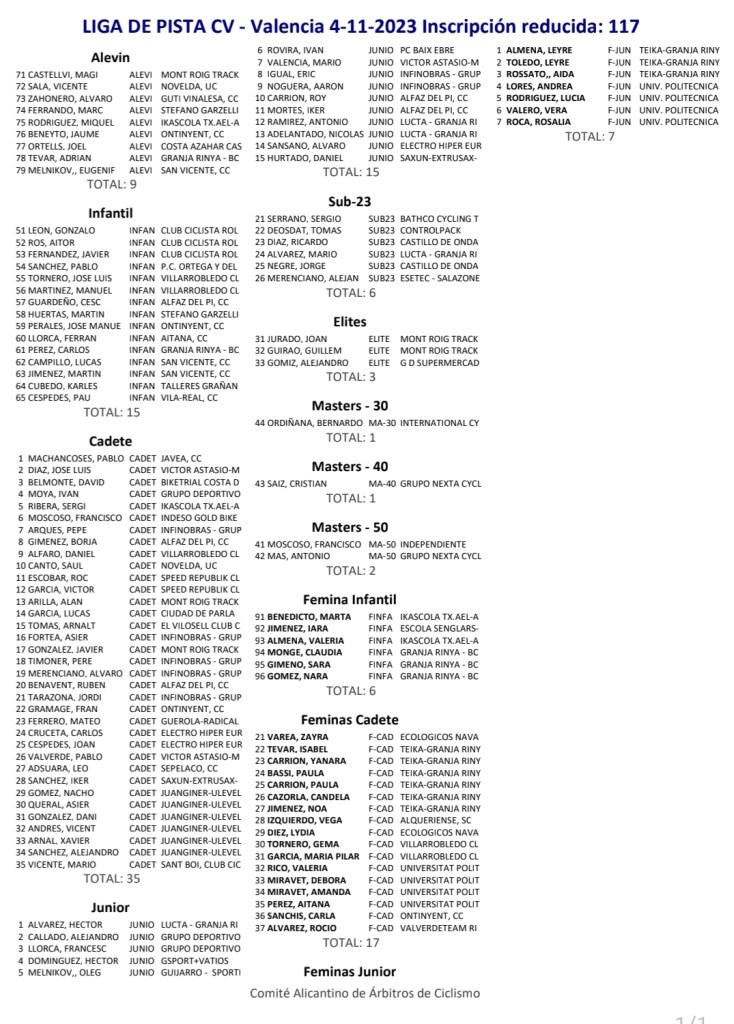 Mañana pistoletazo de salida a la Liga de Pista de la CV 2023/24 con 117 pistard. Resultados, programa y horarios en directo: