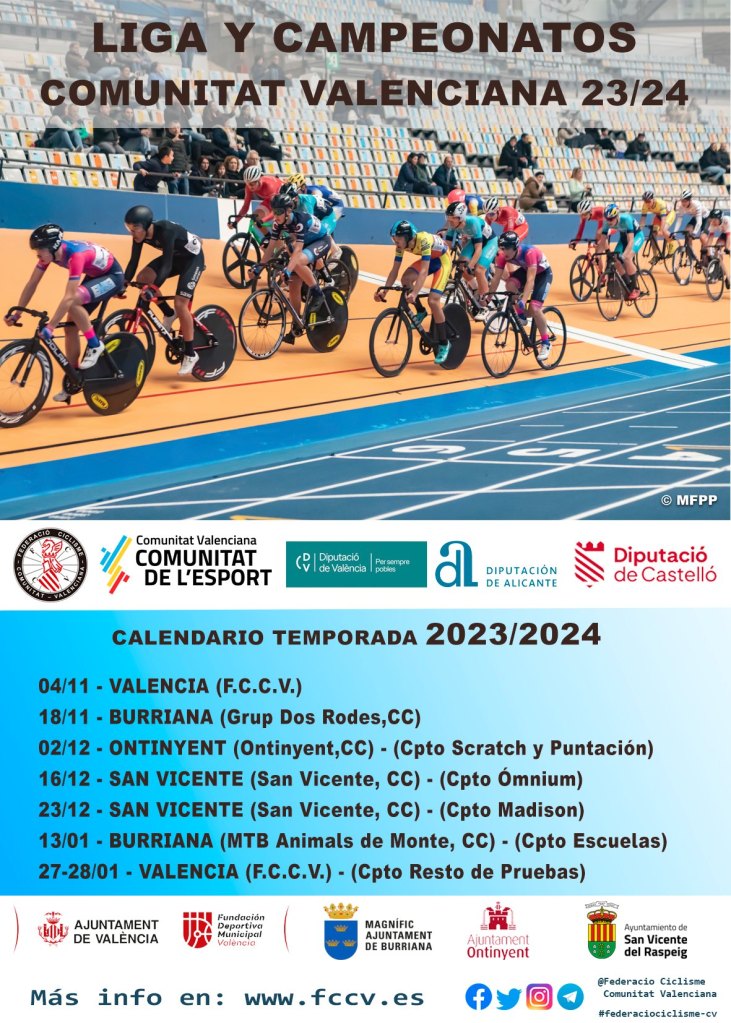La temporada de pista 2023-2024 de la Comunidad Valenciana dará comienzo el sábado, 4 de noviembre, a las 9.30 horas, en el Velódromo Luis Puig de València, organizada por la FCCV. El programa de competición cuenta con Scratch, Tempo y Eliminacion, junto a la prueba final de la Madison. Mas informacion en breve. Las inscripciones están abiertas hasta el jueves a las 20:00h.
