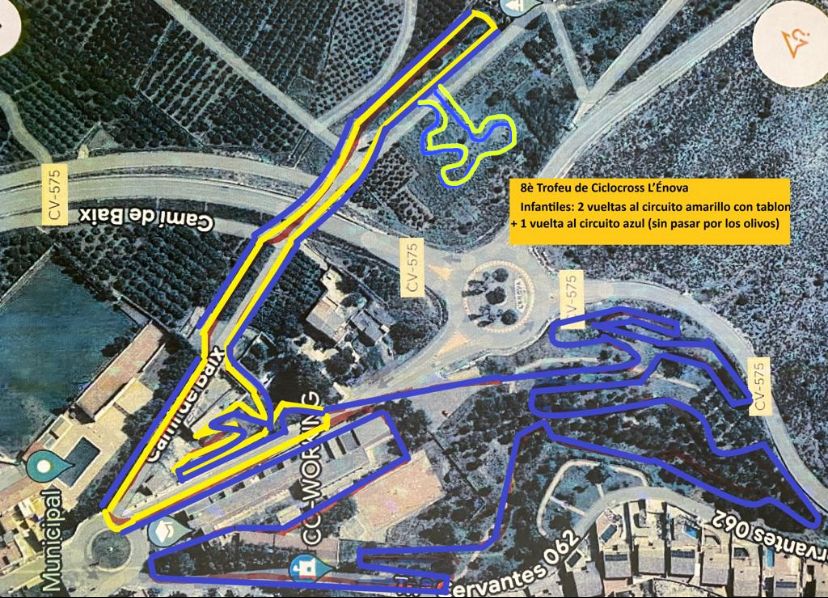 2 vueltas circuito amarillo con tablones (circuito de promesas, principiantes y alevines) y una vuelta al circuito azul (sin paso por la zona de los olivos)