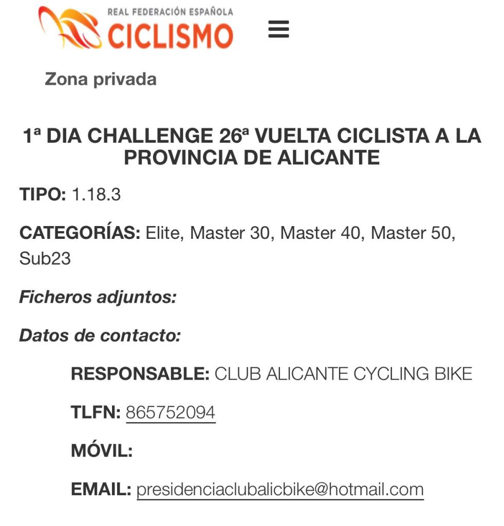 El calendario de la Real Federación Española de Ciclismo para la temporada 2024 ya está disponible y entre las novedades aparece la Challenge Vuelta Ciclista a la Provincia de Alicante que no se disputa desde 2021, prueba que fue ganada por Toby Perry en su veinticinco edición. A petición del Alicante Cycling Bike la carrera se correrá los días 12, 13 y 14 abril, pero será para la categoría Social (Elite, Sub 23 y Máster).