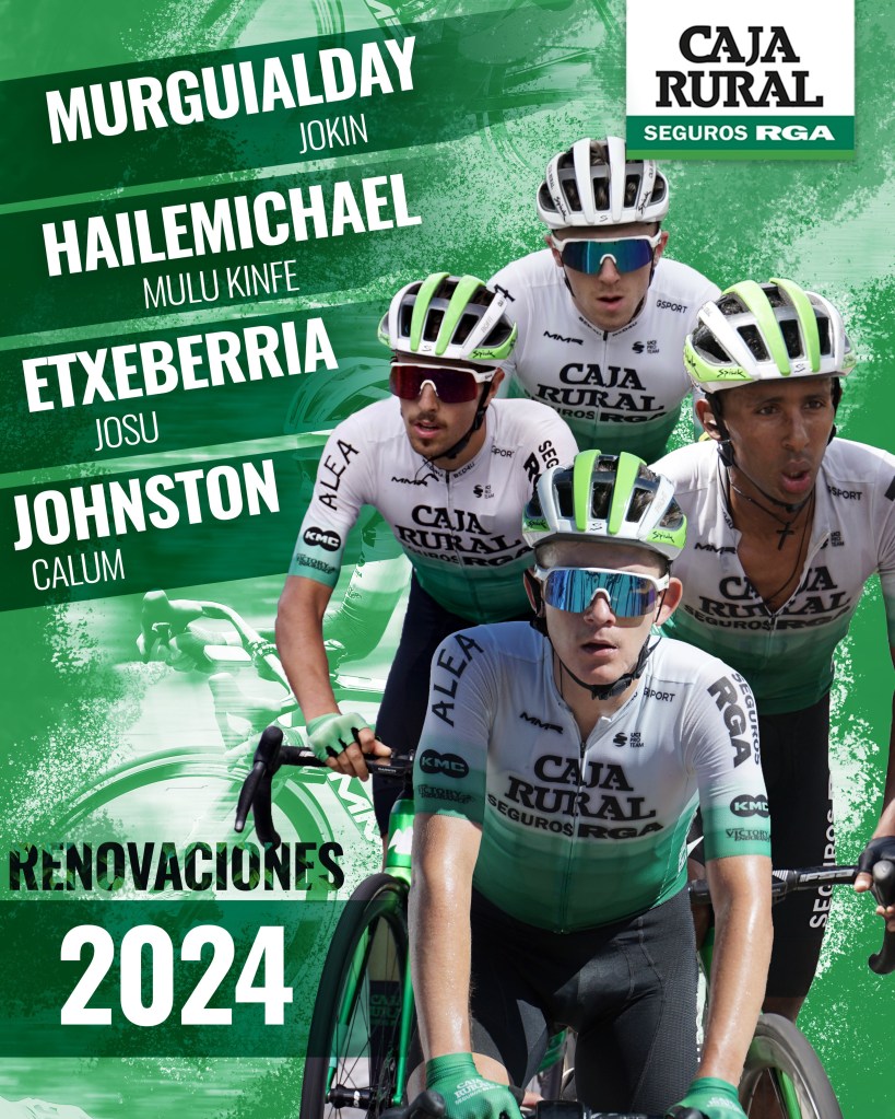 La plantilla de Caja Rural-Seguros RGA continúa tomando forma con el anuncio de cuatro nuevas renovaciones, las de Jokin Murguialday, Josu Etxeberria, Calum Johnston y Mulu Kinfe Hailemichael. Todos ellos dieron el salto a profesionales desde el filial Caja Rural-Alea y continuarán su progresión en la misma estructura.