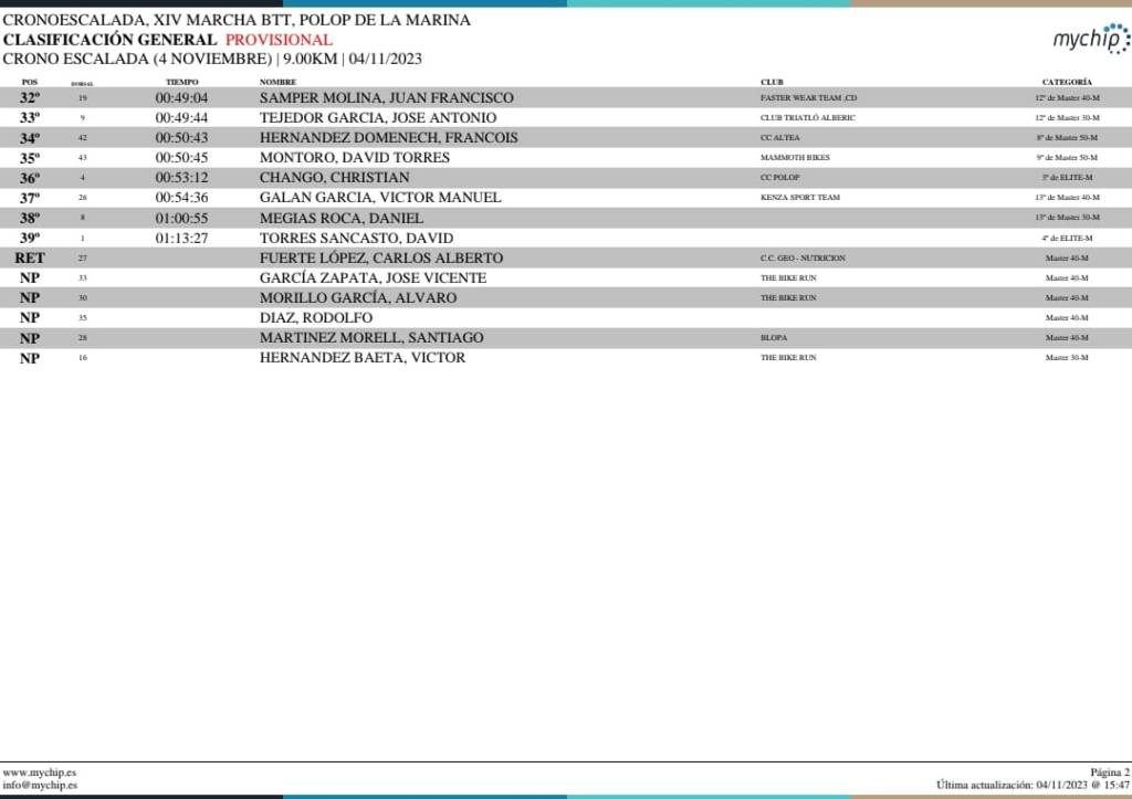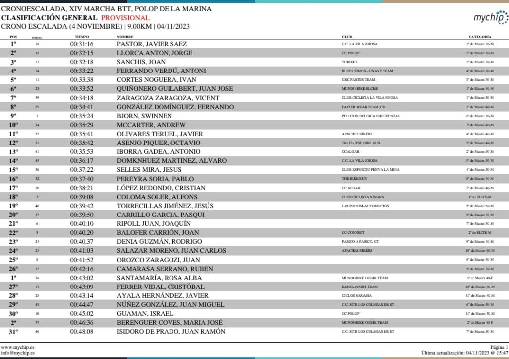 La XIX Marcha Mountain Bike en Polop de la Marina-BTT Weekend ha comenzado hoy con una contrarreloj de nueve kilómetros. Javier Sáez Pastor (CC La Vila) y Rosa Alba (Mundobike) han sido los ganadores. Sáez se ha impuesto en Máster A; Juan José Quiñonero (Mundobike) y Rosa Alba (Mundobike) , en MB; Vicent Zaragoza (CC La Vila), en MC; y Alfons Coloma (CC Xixona), en la categoría absoluta.