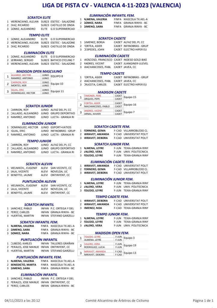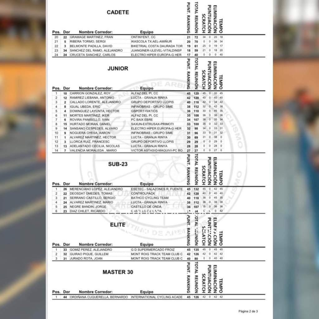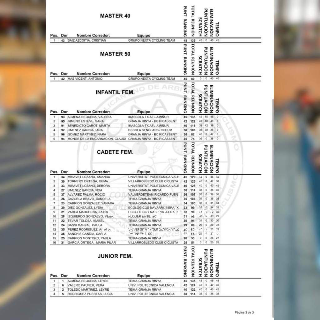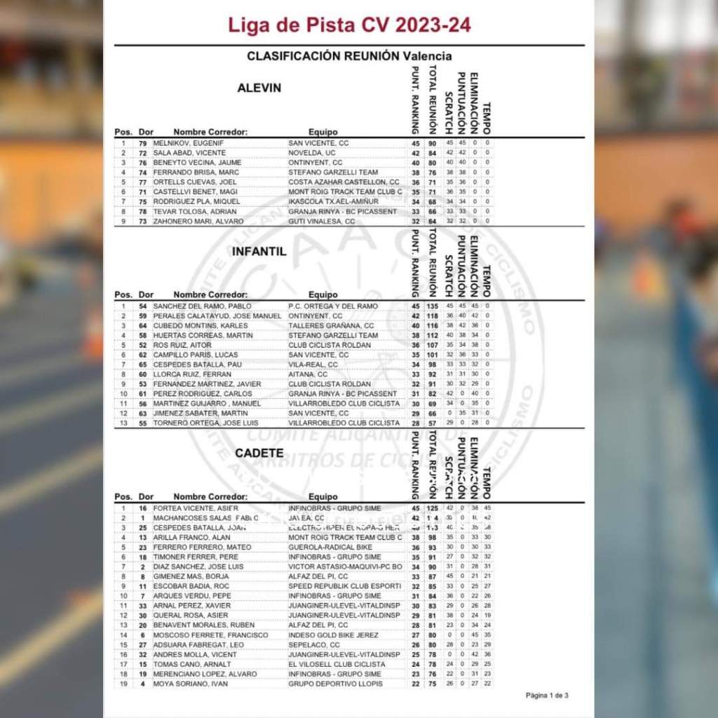 Hoy ha comenzado en el velódromo Luis Puig la primera jornada de la Liga de Pista de la Comunidad Valenciana. Encabezan la clasificación Alejandro Gómiz (Élite), Alejandro Merenciano (Sub 23), Asier Fortea y Amando Miravet, en cadetes; Roy Carrión y Leyre Almena, en júniors; Bernardo Ordiñana, en M30; Cristián Sáiz, en M40; y Antonio Mas, en M50.