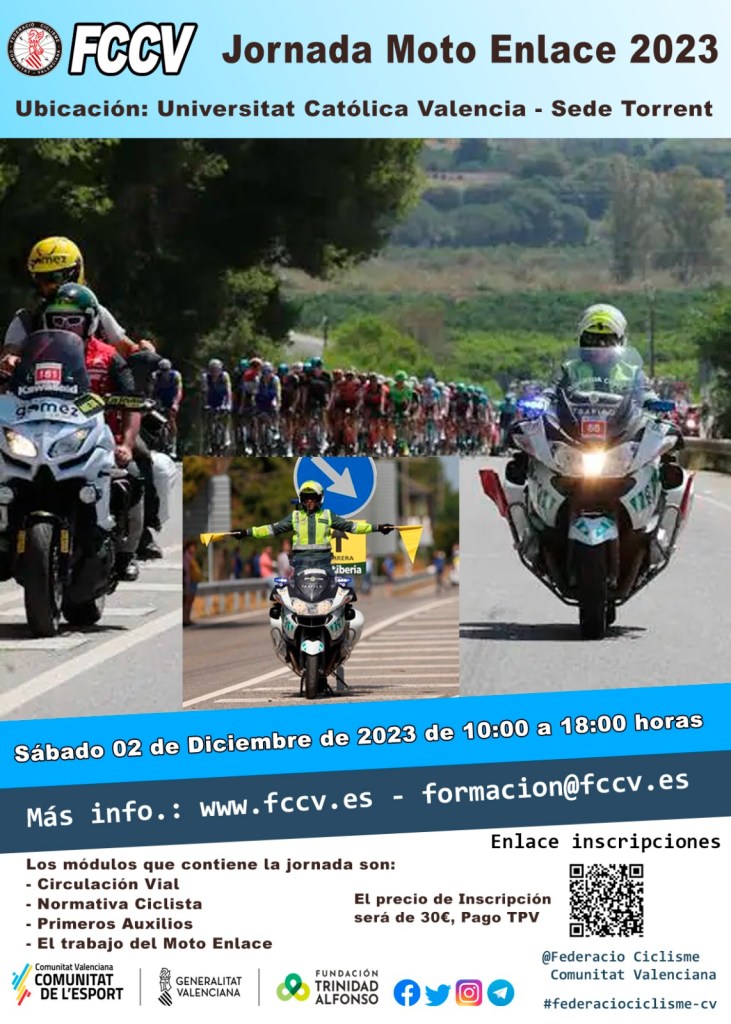 La Federació de Ciclisme de la Comunitat Valenciana (FCCV) convoca el curso de moto enlace 2023 que tendrá lugar en la sede de Torrent de la Universidad Católica de Valencia el próximo 2 de diciembre entre las 10:00 y las 18:00 horas impartido por especialistas en cada materia.