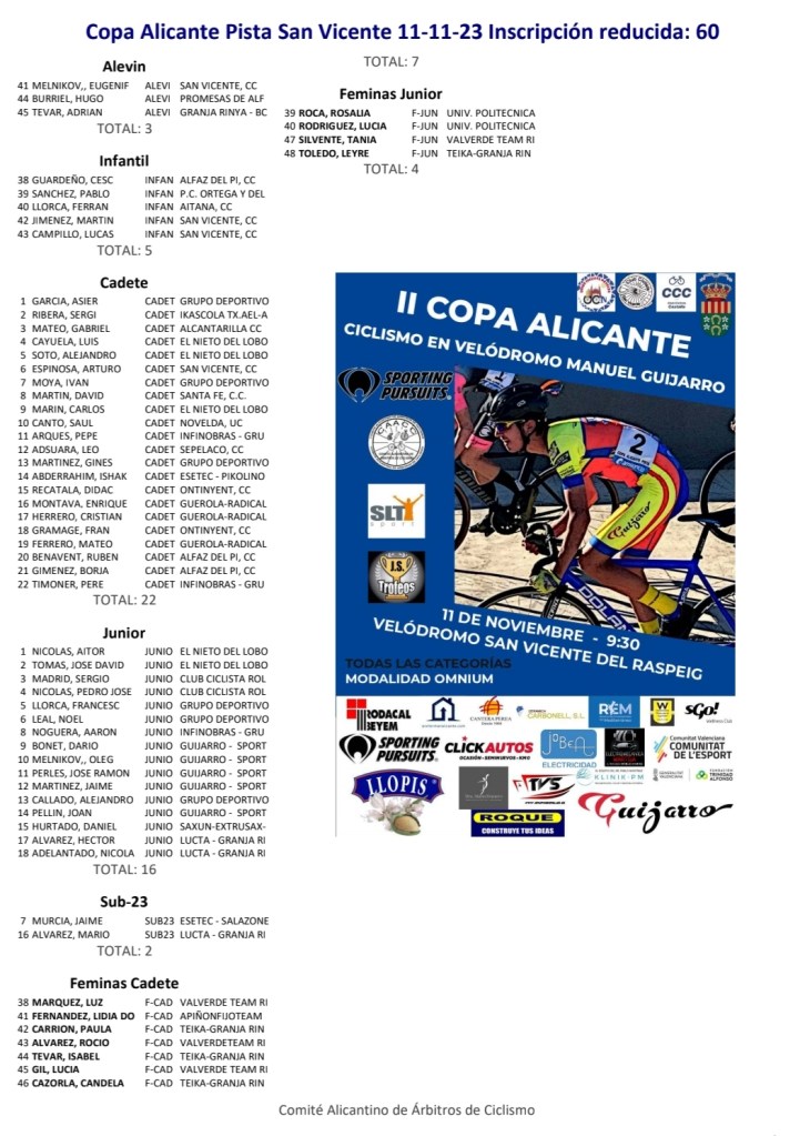 Los inscritos para esta prueba son 60. Aquí se puede seguir la competición: https://pistacv.com/pistacv/copaalicantepista23_24/sanvicente1/index.html