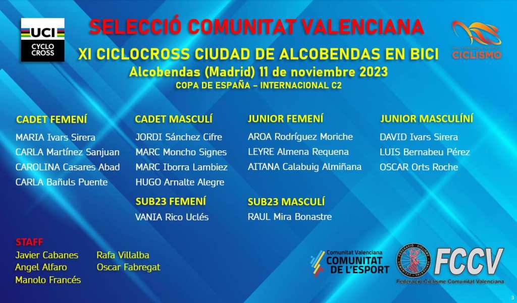 Raúl Mira y Vania Rico, que competirán en Sub 23, encabezan la expedición de la Selección de la FCCV dirigida por Javier Cabanes, completada por los júniors David Ivars, Luis Bernabéu, Óscar Orts, Aroa Rodríguez, Leyre Almena y Aitana Calabuig.