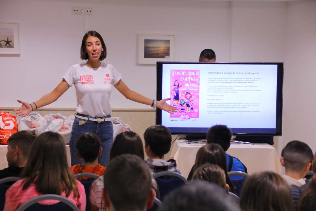 Hoy se ha iniciado el II Campus de la ciclista del Ceratizit Sandra Alonso que se prolongará hasta el domingo 12, con 25 niños y niñas de 8 a 14 años. En el Hotel Playas de Torrevieja se ha producido la recepción y la presentación del campus y la corredora torrevejense ha ofrecido una charla coloquio a los que serán sus pupilos estos días.