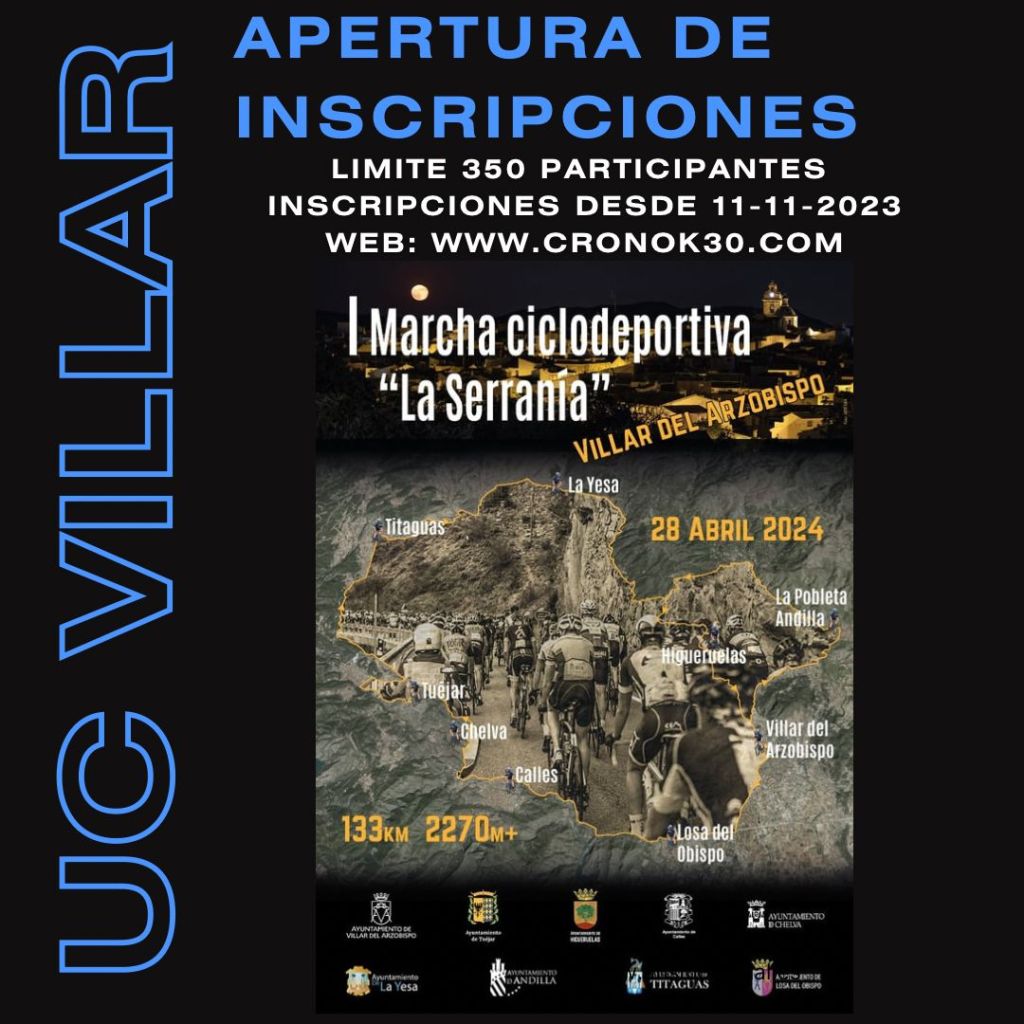 Ya está abiertas las inscripciones de la I MARCHA CICLODEPORTIVA LA SERRANÍA que se disputará en Villar del Arzobispo el 28 de abril organizada por Óscar Fabregat, la UC Villar y los ayuntamientos de la Comarca de Los Serranos. La actividad ciclista contará con 133 kilómetros y un desnivel positivo de 2.270 metros. Más información.