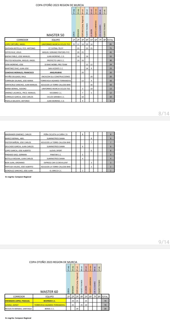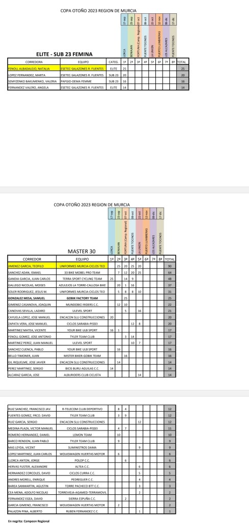 Los otros vencedores de la jornada fueron Ismael Sánchez (33 Bikes), en M30, con José Manuel Cayuela (Encacon), tercero; Ángel López (Uniformes Murcia), en M50, con Francisco Antonio Quesada (Catral -Telfy) y Juan Manuel Santacruz (Azulejos La Torre), en el podio; y Jozsef Juhasz (Torrevieja), en M60.