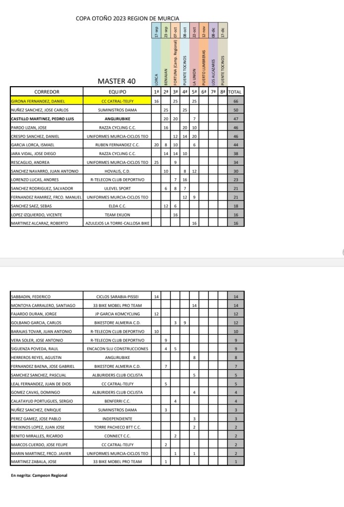 Daniel Girona (CC Catral-Telfy) fue el ganador de la categoría M40. Roberto Martínez (Azulejos La Torre-Callosa Bike) terminó segundo y Jesús Linero (Suministro Dama), tercero. De esta manera, Girona, que fue noveno en la General, consolida su liderato de la categoría Máster 40 en la Copa de Otoño Región de Murcia.