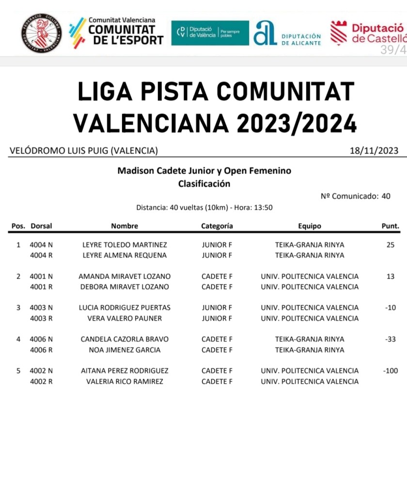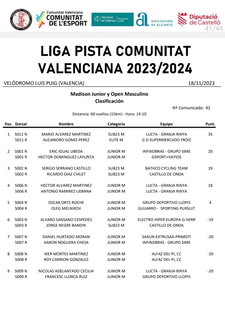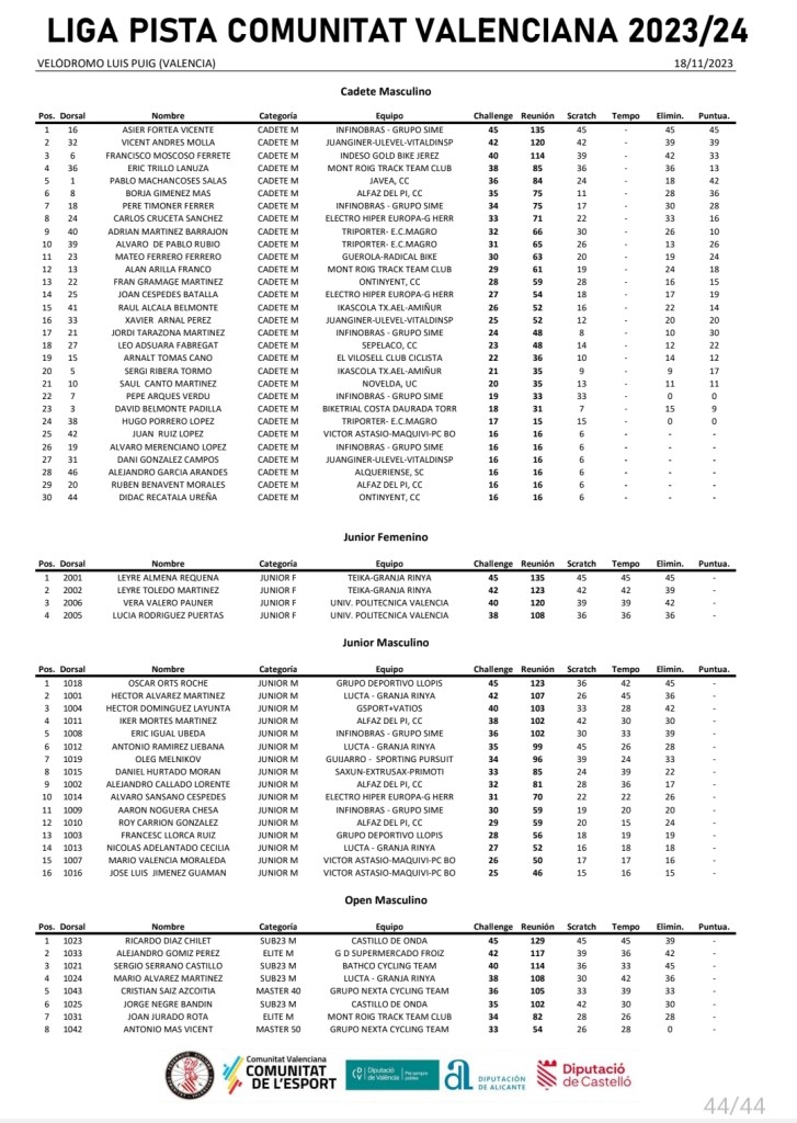 Hoy se ha disputado en el Velódromo Luis Puig la segunda jornada de la Liga de Pista de la Comunidad Valenciana. Los ganadores han sido Ricardo Díaz Chilet (Castillo de Onda), en Open Masculino; Óscar Orts (GD Llopis) y Leyre Almena (Teika), en júniors; Asier Fortea (Infinobras-Grupo Sime) y Amanda Miravet (UPV), en cadetes; José Manuel Perales (Ontinyent) y Valeria Almena (Ikascola), en Infantiles; y Eugeni Melnikov (CC San Vicente), en Alevines.