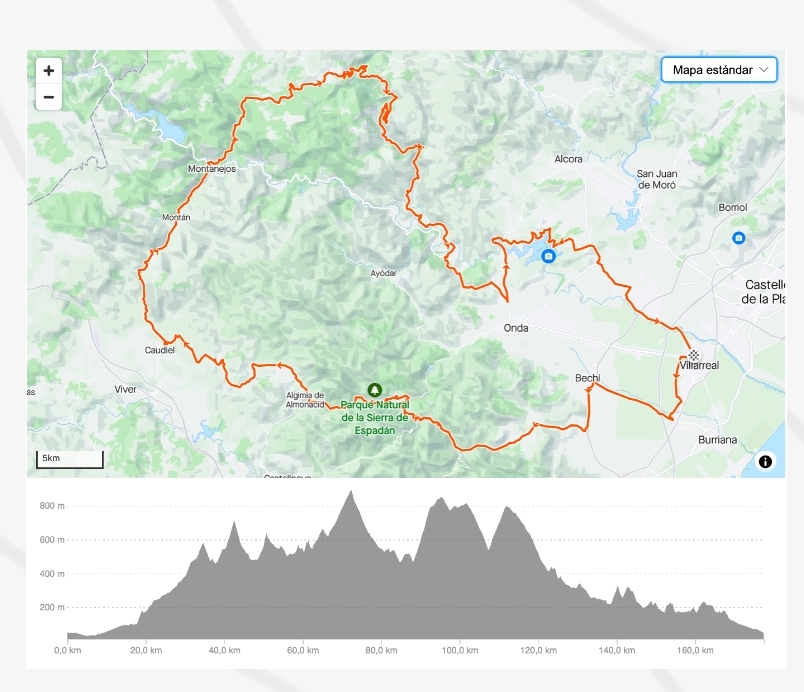 La The Millars Gran Fondo Vila-real se celebrará el 10 de marzo tendrá un recorrido de aproximadamente 180 kilómetros con prácticamente 3.000 metros de desnivel positivo acumulado. Se adentrará en el Parque Natural de la Sierra de Espadán, para continuar por las comarcas del Alto Palancia y Alto Mijares, disfrutando de espectaculares paisajes a través de 4 cimas principales que harán las delicias de todos los participantes.