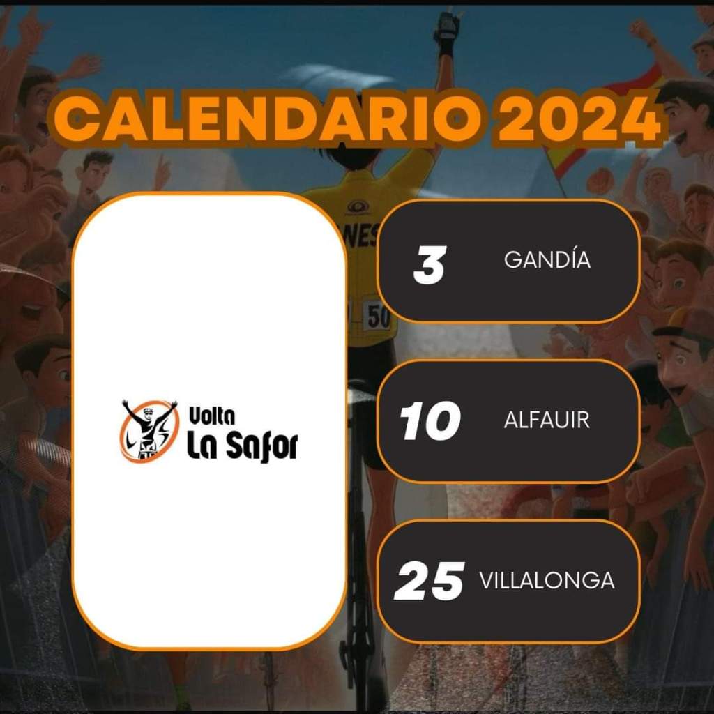 La Volta La Safor contará en la edición de 2024 con tres etapas. La primera en Gandía, el 5 de febrero; la segunda, en Alfahuir, el 10; y la última, que será sin duda la reina, el 25, en Villalonga. En esta última prueba se subirá al gran puerto de La Llacuna de primera categoría que ya conoció la pasada Vuelta a España del 2021 en el que Jack Haig, del Ineos, fue el primer ciclista profesional en inscribir su nombre. La organización ya ha oficializado las dos primeras jornadas.