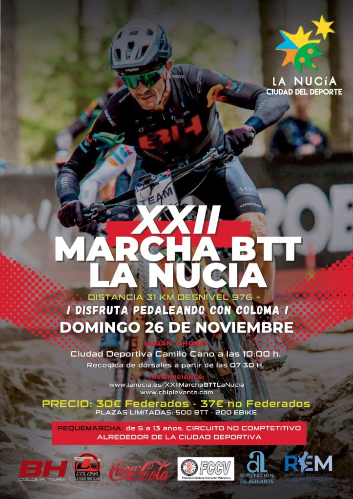 La XXII Marcha de Bicicletas de Montaña (BTT) de La Nucía se disputa el domingo, 26 de noviembre, con más de 500 participantes. La salida está fijada a las 10 de la mañana desde la Ciutat Esportiva Camilo Cano. Esta edición cuenta con dos categorías : Bicis de Montaña (BTT) y Bicis Eléctricas (e-bike).. Todas las personas inscritas antes del 15 de octubre han recibido un maillot GOBIK de regalo.