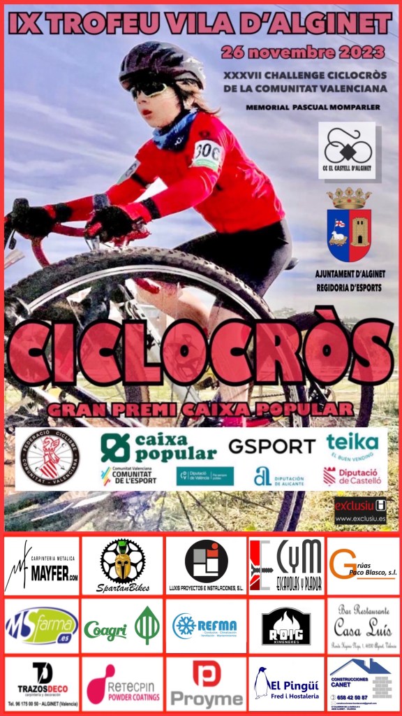 Hoy, 26 de noviembre, se disputa el IX Trofeu Vila d’Alginet de Ciclocross, séptima prueba de la Challenge de CX de la Comunidad Valenciana- Memorial Pascual Momparler, que tras las carreras de Picassent, Aiacor, Agost, L’Énova, Carlet y Castalla lideran Manuel Sánchez Aldeguer (MundoBike) y Lidia Llacer (Triasport).