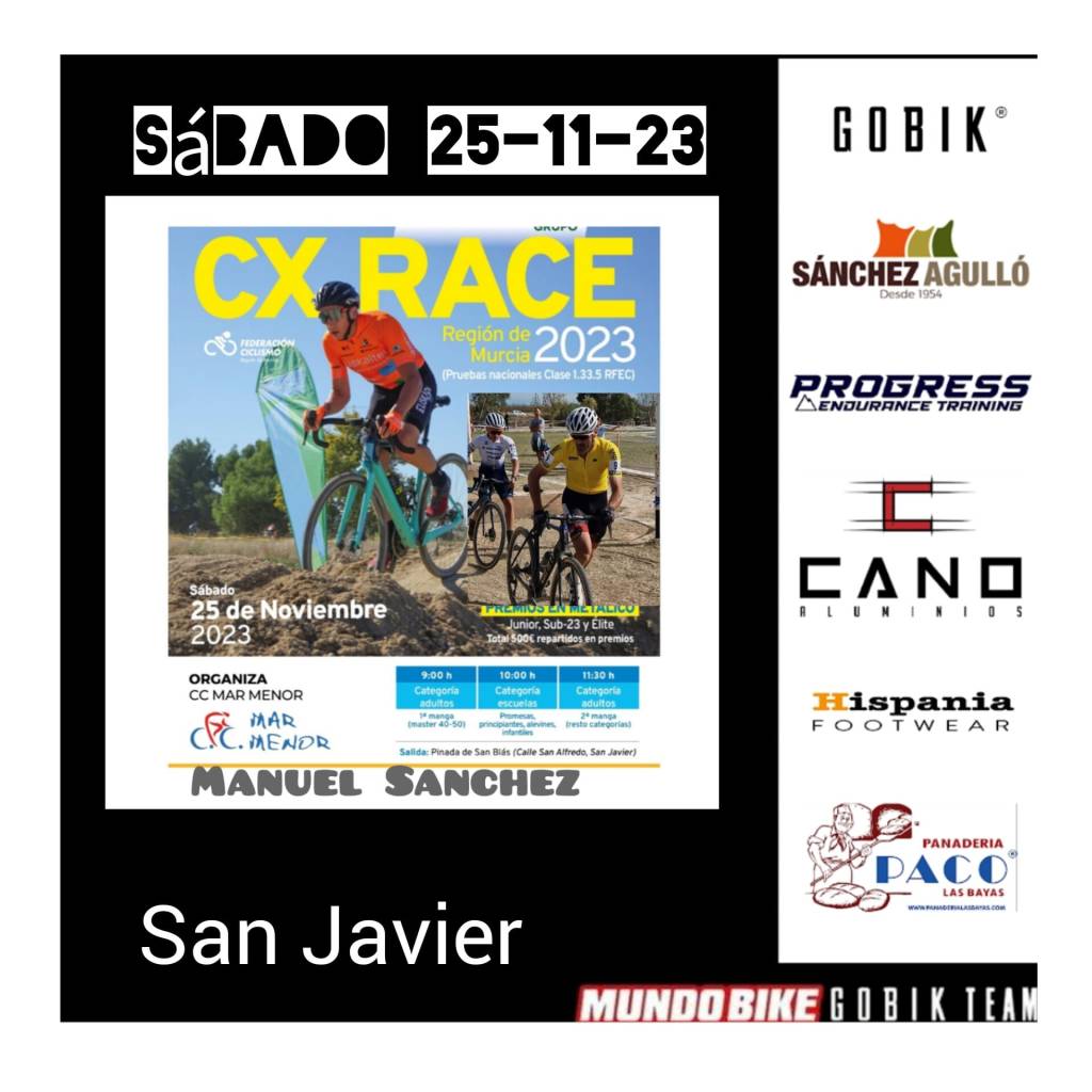 El sábado, día 25 de noviembre, San Javier acoge una nueva prueba del CX RACE Circuito Orenes Región de Murcia 2023. Entre los participantes en el II Gran Premio de Ciclocross Villa de San Javier estará Manuel Sánchez Aldeguer (Mundobike), que el domingo competirá en Alginet en la prueba de la Challenge CX de la Comunidad Valenciana que lidera.