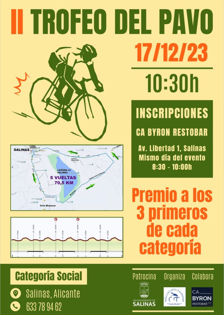El próximo 17 de diciembre se disputa en Salinas el II Trofeo del Pavo. Comenzará a las 10:30 horas y discurre por el magnífico trazado de la Laguna de Salinas. Se darán cinco vueltas a un circuito hasta completar los 70.5 kilómetros de recorrido previstos por la organización.