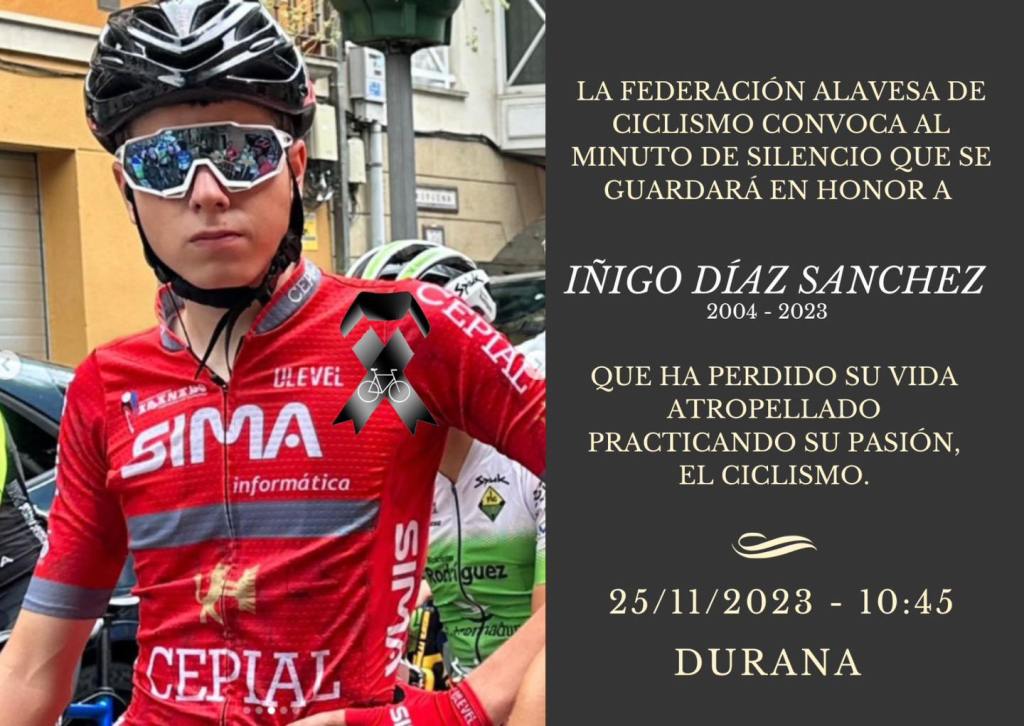 El aficionado Iñigo Díaz Sánchez, de 19 años de edad, ha fallecido hoy tras el atropello sufrido este jueves en una carretera secundaria cercana a la localidad alavesa de Agurain. Nacido en Salvatierra lucía el maillot del Aranako-Sima Cepial Iñigo Díaz.