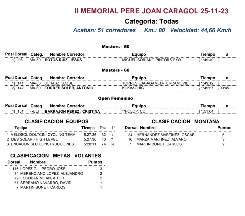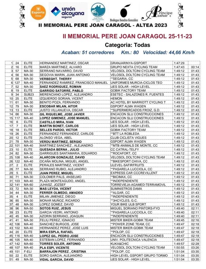 Óscar Hernández (Granja Rinya-Gsport) se ha impuesto esta mañana en el II Memorial Pere Joan Caragol, de categoría open, que se ha disputado hoy en Altea sobre una distancia de 80 kilómetros. Hernández ha entrado en solitario en meta con un tiempo de una hora, 47 minutos y 29 segundos, a una media de 44,6 kilómetros a la hora. A 14 segundos ha entrado Álvaro Marzá (Grupo Nexta), y, a 1-43, dando tiempo al grueso del pelotón, David Serrano (Velosol). Óscar Hernández también se ha llevado la montaña; Pedro José López (Encacon), las metas volantes; y el Velosol ha sido la mejor escuadra.