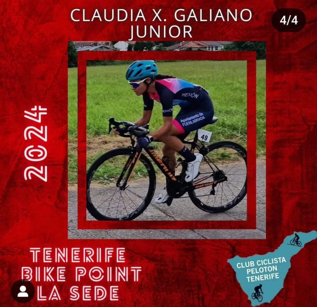 Claudia Xiangfeng Galiano correrá en 2024 con el maillot del Tenerife Bike Point-La Sede su segundo año como júnior tras su paso por el Fuenlabra. «Este cambio de equipo ha sido como consecuencia de que al cuerpo técnico de mi anterior equipo les ofrecieron la oportunidad de formar parte de la directiva del Tenerife Bike Point – La Sede. Me siento muy a gusto y agradecida de que confíen en mí para este nuevo proyecto que parece una propuesta muy interesante y con mucha proyección de futuro», señala la corredora alicantina antes de mirar atrás y dar las gracias al que ha sido su escuadra durante 2023: «Agradezco muchísimo a la UC Fuenlabrada por acogerme estos dos últimos años, habiéndome dado la oportunidad de correr Copa España, así como la Vuelta Cantabria, Vuelta a Pamplona y todas las vueltas internacionales en Portugal, haciéndome sentir muy valorada».