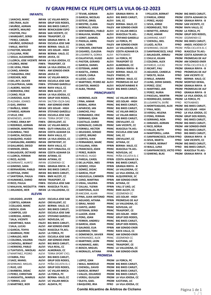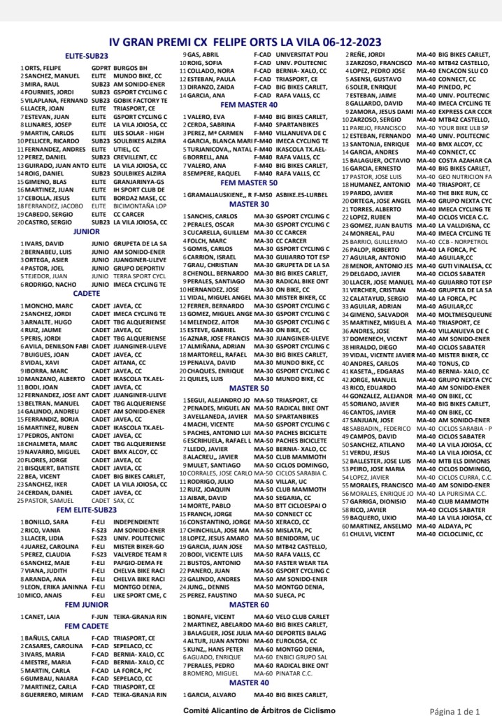 Felipe Orts (Burgos BH) se ha impuesto en La Vila en la cuarta edición del Gran Premi que lleva su nombren, prueba puntuable para la Challenge de CX de la Comunidad Valenciana. Segunda plaza para Manuel Sánchez Aldeguer (MundoBike) y, tercera, para Raúl Mira, primer Sub 23. En féminas, triunfo de Sara Bonillo por delante de Vania Rico, primera Sub 23, y de Lidia Llacer. El circuito El Torres de lo localidad alicantina se ha vestido de fiesta para ver a su ídolo y ha podido disfrutar el triunfo de su paisano, que ha atravesado la línea de meta haciendo su ya tradicional «caballito». “Ha sido un día genial. Al final esta carrera va más allá de lo deportivo y busca acercar el ciclocross a toda la gente de La Vila. En lo deportivo muy bien también. Las sensaciones han sido muy buenas. Hemos trabajado bien y el nivel creo que está ahí. Nos sirve para coger ritmo de cara a Tarazona, Xàtiva y Valencia”, señaló el vencedor.