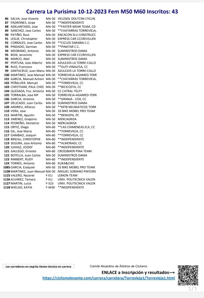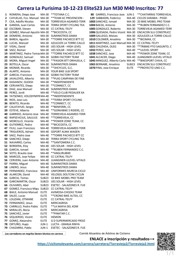 El domingo, día 10 de diciembre, se disputará en Torrevieja la Carrera Ciclista «La Purísima 2023»- Memorial Antonio Carbonell. La prueba tiene carácter social y contará con dos mangas. En la primera, competirán Féminas, Máster 50 y Máster 60. Y, en la segunda, Élite y Sub 23, júniors, Máster 30 y Máster 40. Son 120 los inscritos.