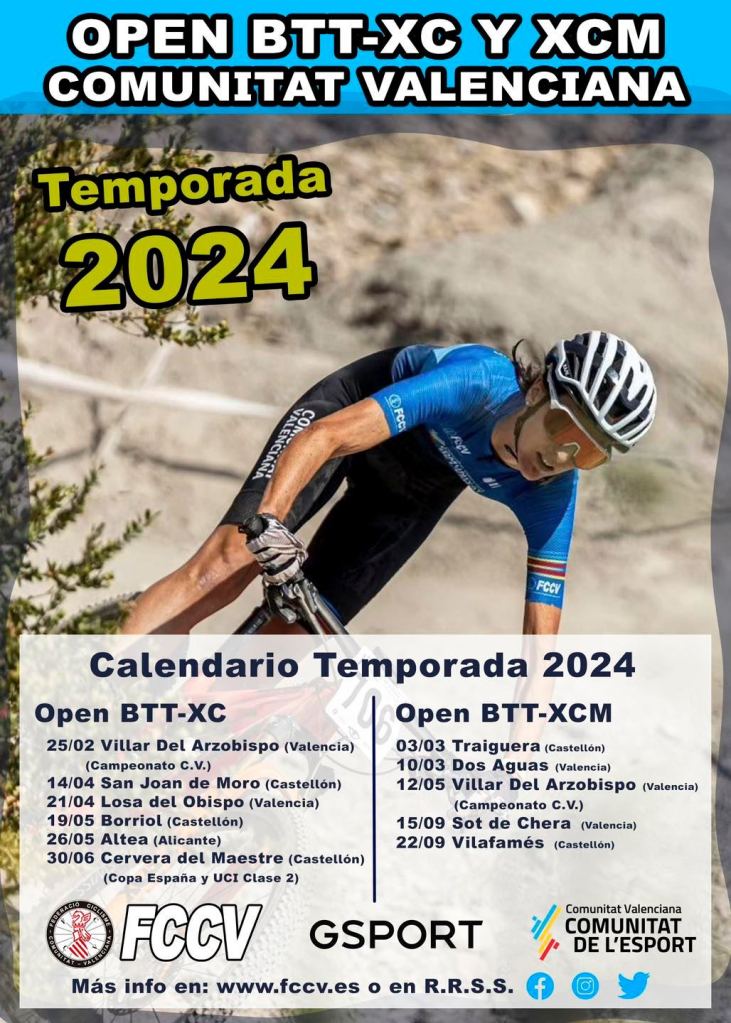 La Federación de Ciclismo de la Comunidad Valenciana ya ha hecho oficial los calendarios del OPEN BTT XC y del OPEN BTT XCM para la temporada 2024. El primero comenzará 25 de febrero con la celebración del Campeonato Autonómico en Villar del Arzobispo. Luego vendrán las pruebas en Sant Joan de Moro, Losa del Obispo, Borriol, Altea y Cervera del Maestre conforman esta modalidad de BTT.