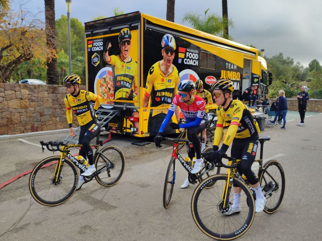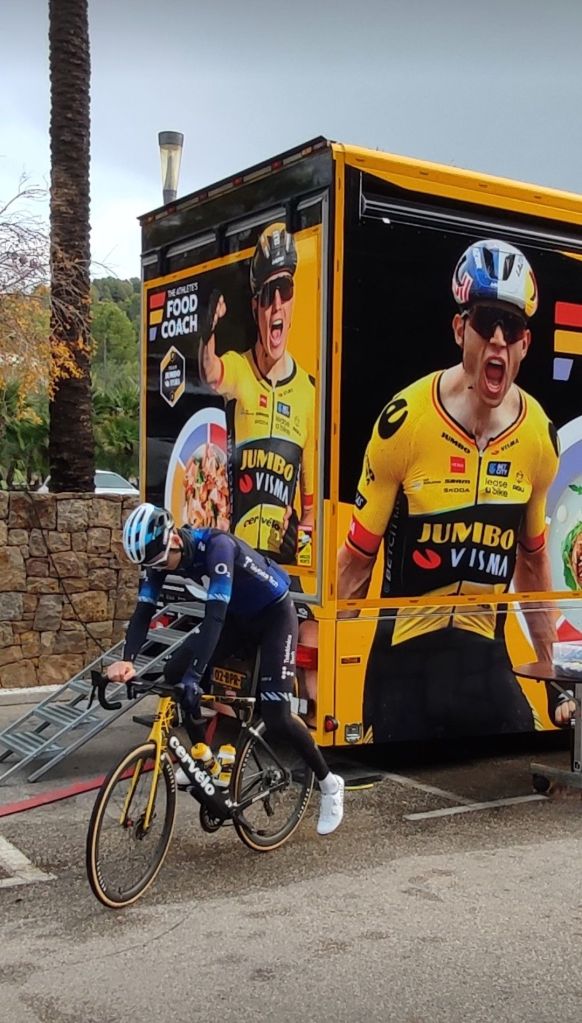 El Jumbo ha viajado con todos o sea hasta el jefe supremo del equipo Richard Plugge que no esconde que está zona es una maravilla. En estos momentos el equipo está entrenando con diferentes grupos y rodando por las comarcas de La Marina, La Safor, Vall d’Albaida y Alcoia, realizando unas 5 horas en bicicleta y de paso probar las nuevas herramientas que deberán llevar los ciclistas para el próximo año. Pero sin duda lo que más expectación ha traído a está primer stage es la incorporación de Cian Uijdebroeks, el joven corredor que ha fichado por el Jumbo tras su salida tortuosa del Bora. El corredor va vestido de negro e intentando pasar desapercibido sobre todos los demás con su nueva bicicleta que incluso la tiene rotulada con su nombre. Otra de las nuevas incorporaciones es la del ex Movistar Matías Jorgensson que habla sin tapujos en decir que esto del Jumbo es un equipo como dios manda. Jorgensson empezará la temporada en tierras belgas.