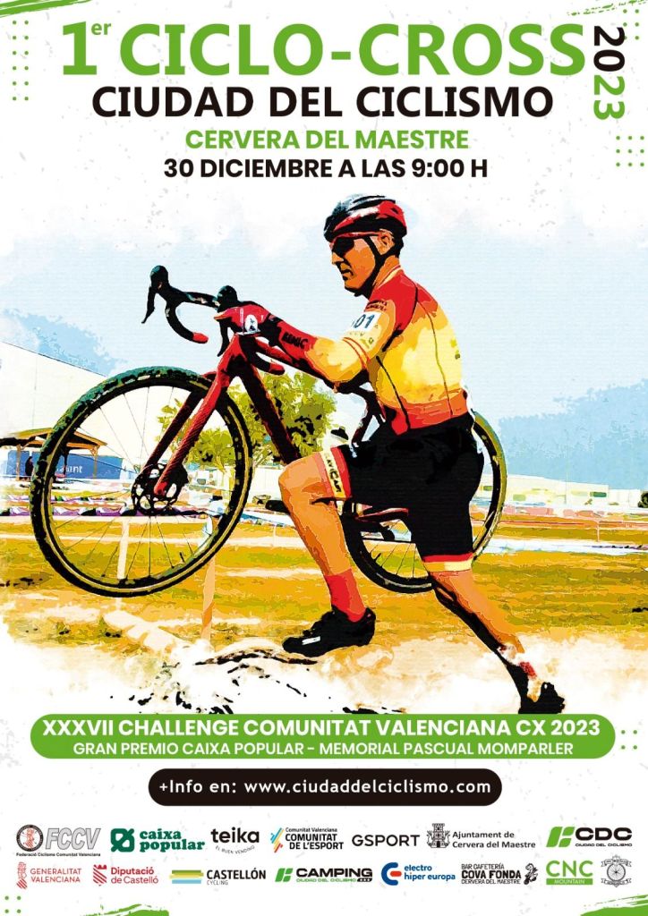 Hoy sábado, día 30 de enero, se disputa en Cervera del Maestre, el I Ciclocross Ciudad del Ciclismo, a partir de las 9 horas. Será la última prueba de la XXXVII Challenge Comunitat Valenciana CX 2023-Gran Premi Caixa Popular-Memorial Pascual Mompaler que lideran Manuel Sánchez Aldeguer y Carolina Juárez. Aldeguer y Juárez dominan la clasificación en la categoría élite; y Lidia Llacer (UPV) y Joan Llacer (Triasport), la de los Sub 23. Marc Moncho (CC Jávea) y Carolina Casares (Sepelaco) son los mejores cadetes; y Joel Pastor (GD Llopis) y Aroa Rodríguez (Teika) comandan la clasificación júnior. El resto de líderes son: Óscar Perales (Gsport Cycling), en Máster 30; Álvaro García (Big Bikes) y Sabrina Cerdá (Spartanbikes), en M40; Rima Gramaliauskiene (Asbike) y Alejandro José Seguí (Triasport), en M50; y Vicent Bonafe (Veloclub Carlet), en M60.