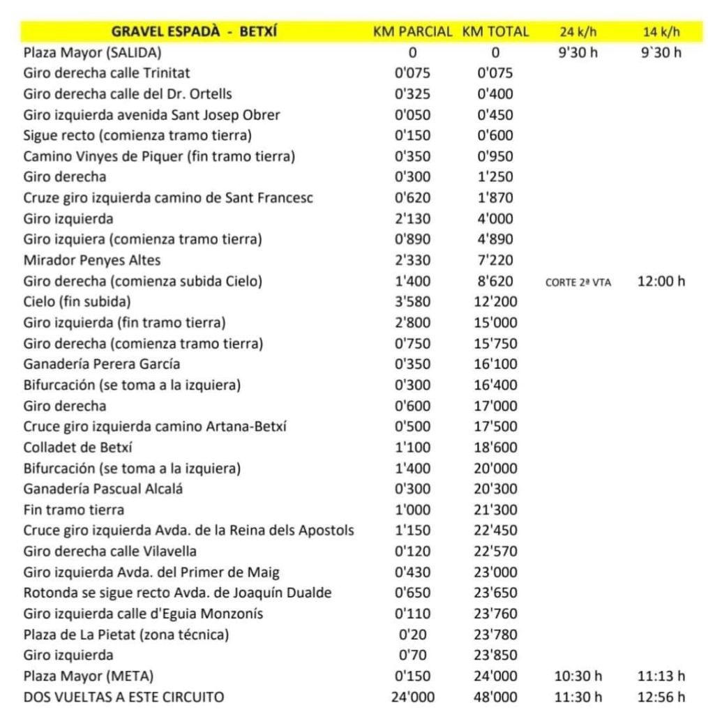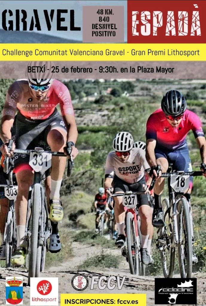 La recién creada “Challenge Comunitat Valenciana Gravel-Gran Premio Lithosport” comenzará el 25 febrero en la localidad de Betxí y acabará en Llutxent, el 26 de mayo con la celebración del Campeonato Autonómico y pasará por las poblaciones de Traiguera, Vistabella, Sax, Vall d’Uixó, Carlet y Benicolet. La prueba inaugural se llevará a cabo en la población de Betxí, a las 9:30 horas, bajo la denominación de Gravel Espadà y organizada por Cicloclinic C.C.