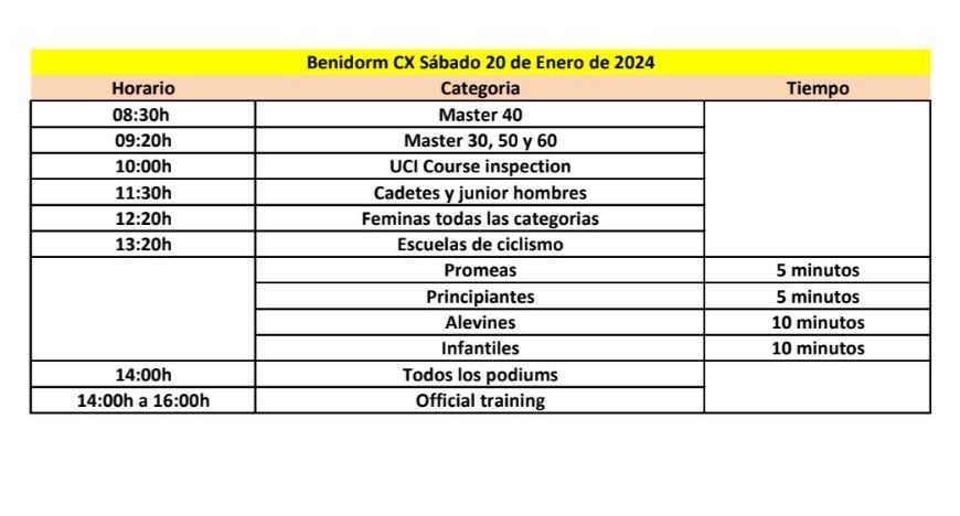 Los niños empezarán a competir a las 13.20 horas debido a que los inspectores de la UCI tienen que supervisar el circuito a las 10 de la mañana. Este ha sido el motivo del atraso de la prueba que bien puede servir para presenciar la salida de la Clásica de la Comunidad Valenciana que tendrá lugar a pocos kilómetros en La Nucía.