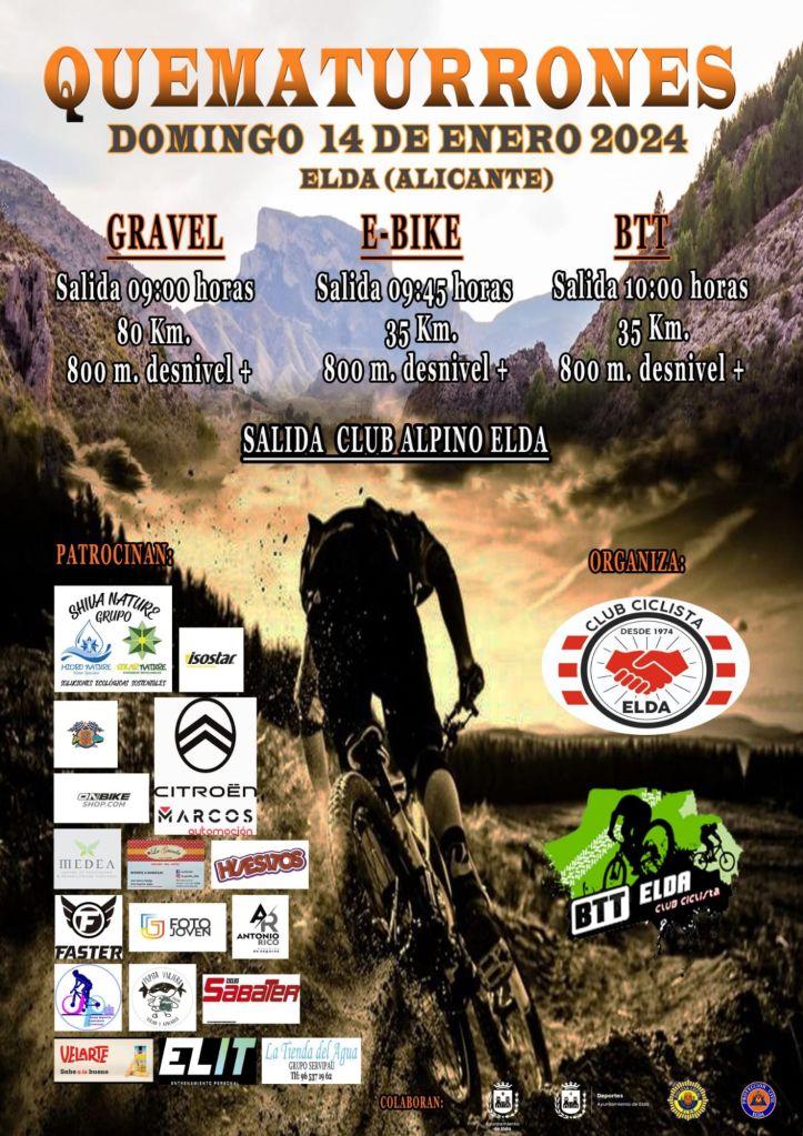 La III edición de la Marcha BTT y Gravel Quematurrones Elda se disputará el domingo, día 14 de enero con salida en la localidad alicantina. La prueba ofrece 3 rutas (55, 34, 34 km) para bicicleta eléctrica, gravel, bike y bicicleta de montaña. La partida se realizará de forma neutralizada desde la zona del Club Alpino eldense.