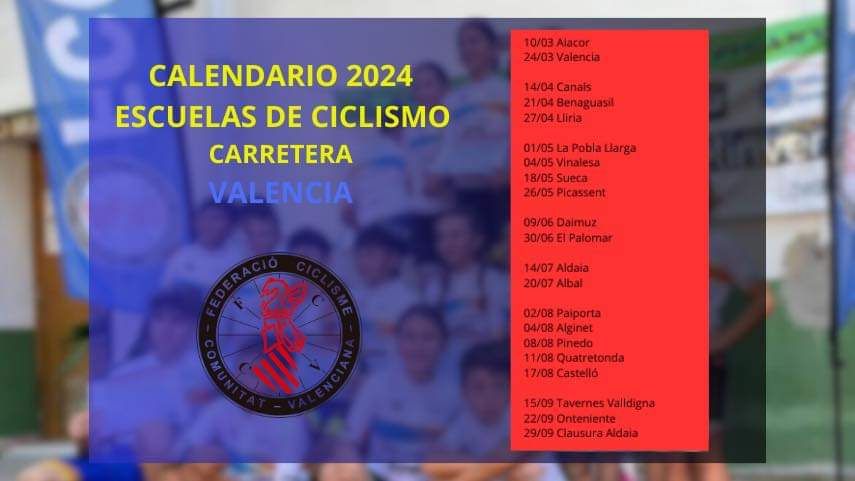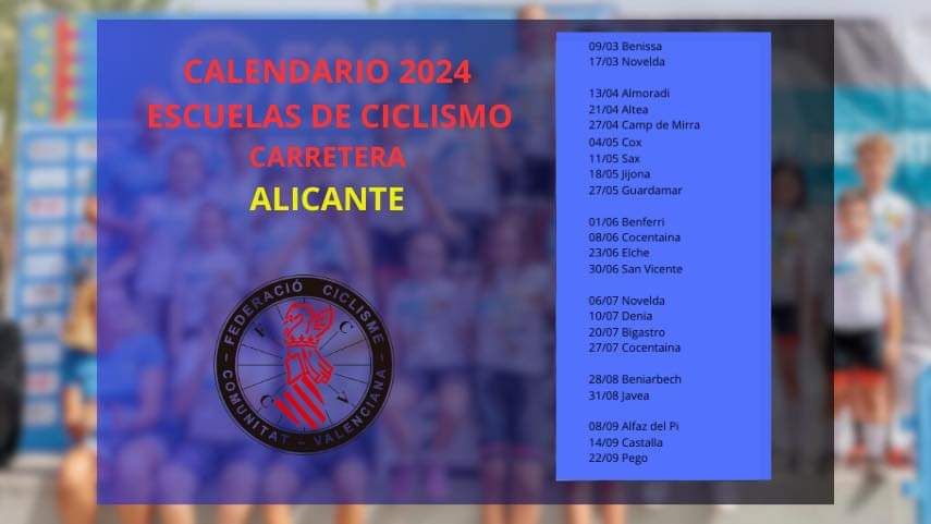 La FCCV ha configurado un pre-calendario de las pruebas de las Escuelas de Ciclismo de la Comunidad València para 2024: 22 en Alicante, 18 en Castellón y 21 en València. En Alicante y Valéncia comienzan la temporada el 9 y 10 de marzo, respectivamente mientras que Castellón dará comienzo la competición durante el mes de abril. Estas son las fechas y localidades confirmadas hasta el momento: