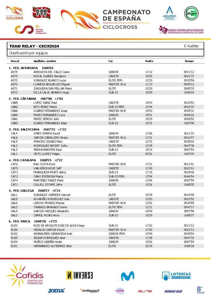 La prueba de Team Relay ha dado el pistoletazo de salida al Campeonato de España de Ciclocross que acoge Amurrió hasta el domingo. Asturias (Mario Junquera, Lucía González, Hugo de la Calle, Canor Arboleya, Benjamín Noval y Miguel Llaneza) ha sido la ganadora por delante de Cantabria (Julio Pérez, Marta Beti, Alain Suárez, Luca Matei, Raúl López y Isaac Suárez) y de la Comunidad Valenciana. En el bronce de la FCCV ha tenido mucho que ver el relevo final de Felipe Orts, al igual que el anterior de Raúl Mira, a la hora de remontar posiciones. Cuarta plaza para Cataluña y quinta para Galicia.