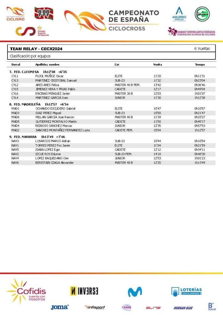 Javier Cabanes, seleccionador de la FCCV, ha comentado al final de la prueba: «No puedo decir que sabe a poco siendo consciente del circuito y las condiciones. Debemos estar contentos con el resultado. La experiencia de un Team Relay para los corredores es una gran oportunidad de hacer equipo, ya que el ciclocross es individual. También los que hacen el Team Relay ya tienen un poco de ventaja respecto a los que no lo han hecho. Veo al grupo muy motivado para lo que nos queda».