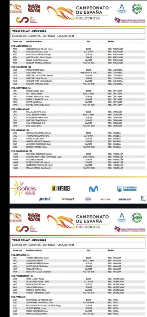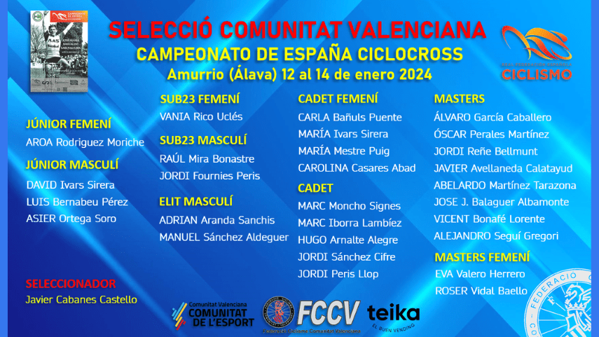 Javier Cabanes, seleccionador de ciclocross de la FCCV, cuenta para este Nacional con los cadetes Carla Bañuls, María Ivars, María Mestre, Carolina Casares, Marc Moncho, Marc Iborra, Hugo Arnalte, Jordi Sánchez y Jordi Peris; los júniors Aroa Rodríguez, David Ivars, Luis Bernabeu y Asier Ortega; los Sub 23 Vania Ricó, Raúl Mira y Jordi Fournies; los élites Adrián Aranda y Manuel Sánchez Aldeguer; además de con los Masters: Álvaro García, Óscar Perales, Jordi Reñé, Javier Avellaneda, Abelardo Martínez, Jose J. Balaguer, Vicent Bonafe, Alejandro Seguí, Eva Valero y Roser Vidal.
