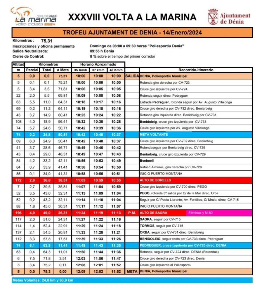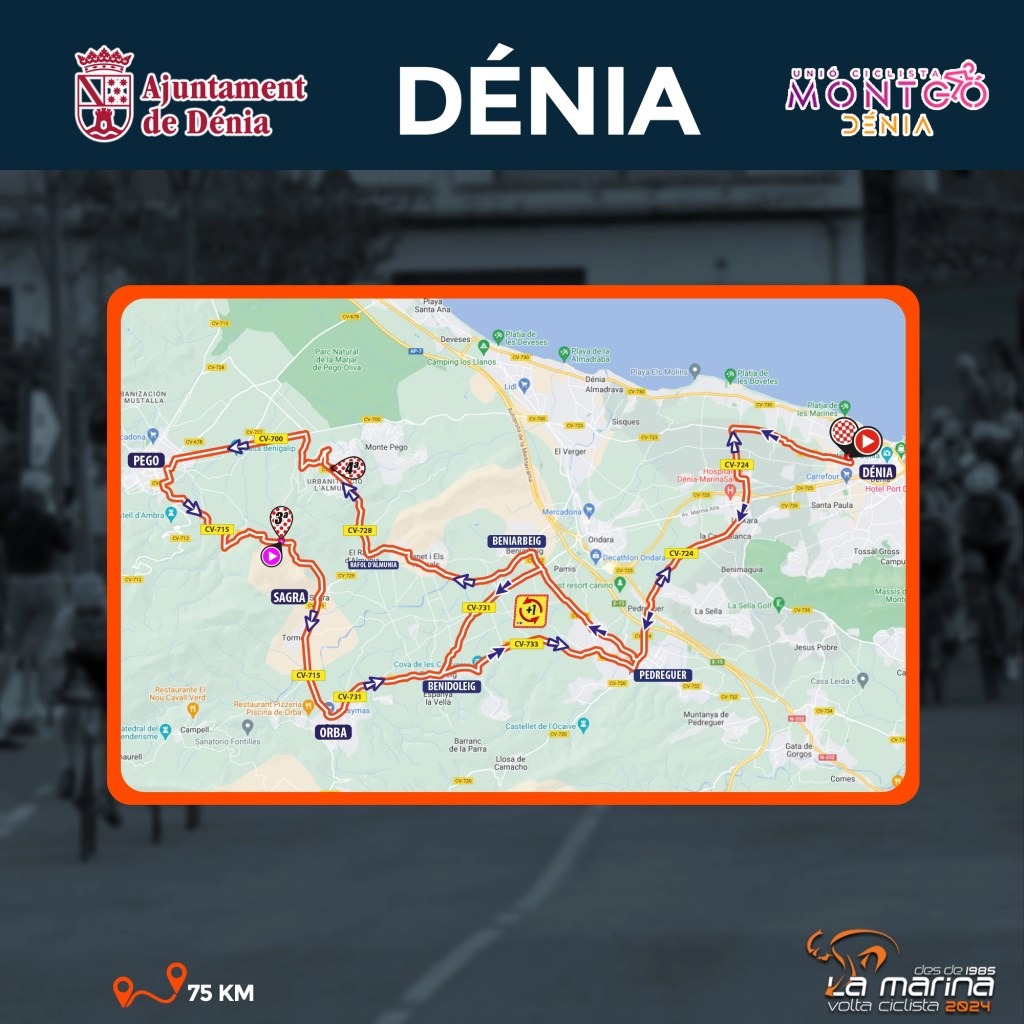 La XXXVIII Volta La Marina 2024 comenzará el domingo, 14 de enero, en Dénia y finalizará en Parcent el 17 de marzo. Son ocho jornadas las que cuenta la ronda. Además de etapa inicial en Dénia y la final en Parcent, el resto de jornadas son las siguientes: en Bolulla (Etapa 2-28 de enero); Pego (Etapa3-4 de febrero); Benissa (Etapa 4-11 de febrero); Barxeta (Etapa 5- 25 de febero); Pedreguer (Etapa 6-3 de marzo); además del Trofeu Femines de Ondara, previsto para el 10 de marzo.