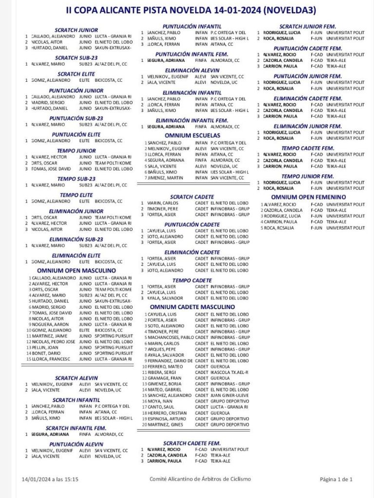 El velódromo Luis Navarro de Novelda ha disfrutado hoy de la quinta prueba de la Copa Alicante que disputará la Final en San Vicente del Raspeig el día 21 de enero. Los ganadores de la jornada han sido Alejandro Gómiz, en la categoría Élite; Mario Álvarez, en Sub 23; Alejandro Callado y Lucía Rodríguez, en Júnior; Luis Cayuela y Rocío Álvarez, en cadetes. En la categoría de Escuelas, triunfos de Pablo Sánchez y Adriana Segura, en Infantiles, y de Eugenif Melnikov, en Alevines.