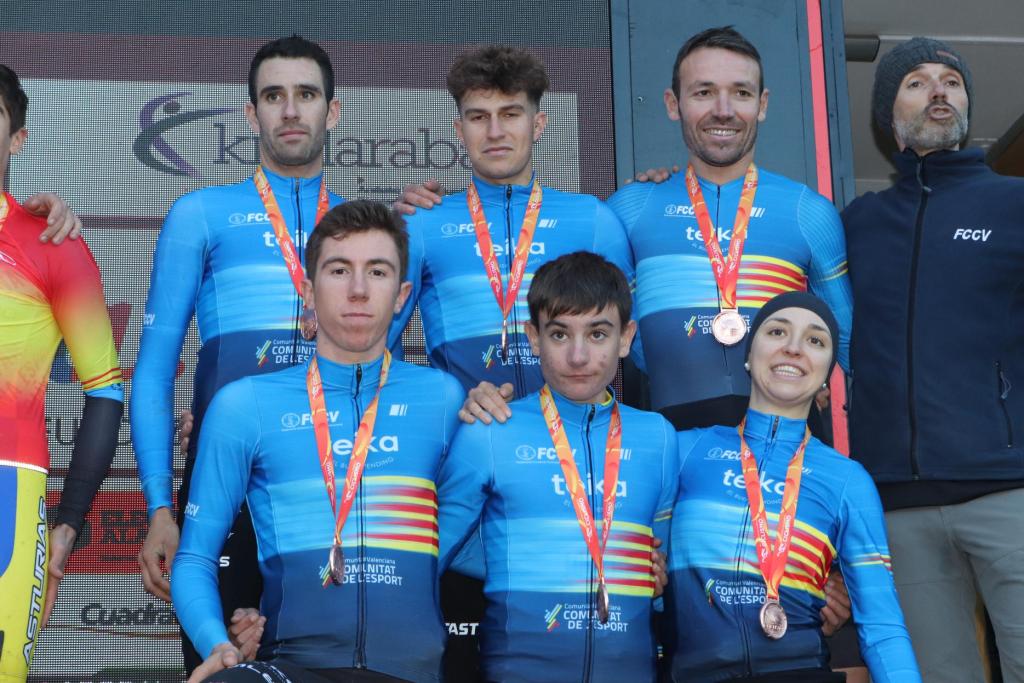Javier Cabanes, seleccionador de la Comunidad Valenciana de Ciclocross, regresó a casa satisfecho del rendimiento dado por sus pupilos en el Campeonato de España de CX disputado este pasado fin de semana en Amurrio. El combinado autonómico ha logrado ocho medallas. Cuatro de oro, gracias a los triunfos de Abelardo Martínez, en Máster 60B; Eva Valero, en M40; Álvaro García, en M40A; y Raúl Mira, en Sub 23. La dos de plata se las han colgado Carla Bañuls, en cadetes femenino, y, Vicent Bonafé, en M60A. Y las de bronce, José Julián Balaguer, en M60A, y el equipo de Team Relay formado por Felipe Orts, Sofía Rodríguez, Raúl Mira, David Ivars, Marc Moncho y Álvaro García. «El balance de los campeonatos es ilusionante de cara al futuro próximo y muy positivo al repasar los resultados, aunque como es lógico siempre queremos más. No obstante, debemos ser consientes de que cada año hay más participación y más formación en la disciplina», apunta el técnico.