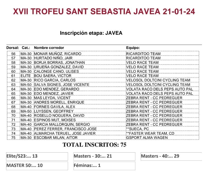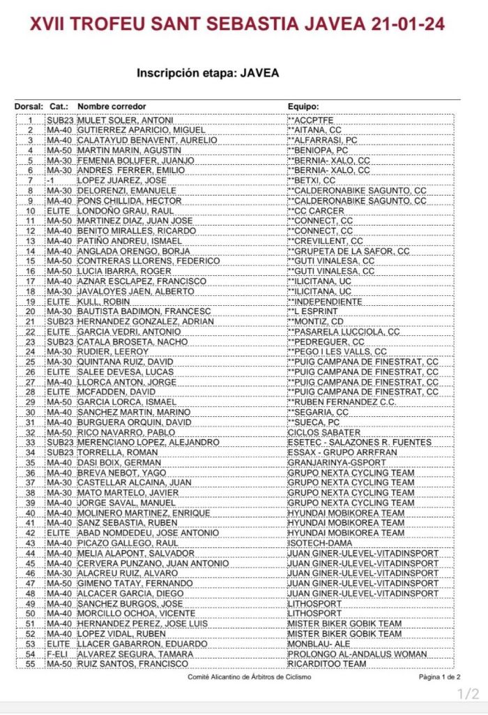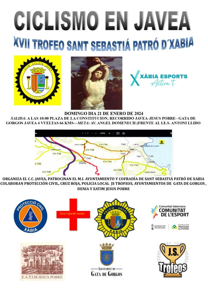 El domingo, 21 de enero se disputa en Jávea el XVII Trofeo Sant Sebastiá. La prueba comenzará a las 10 horas y contará con 66 kilómetros. Se darán cuatro vueltas a este circuito: Jávea, Jesús Pobre, Gata de Gorgos y Jávea. La meta estará situada en la Avenida Ángel Domenech. Se han inscrito 75 ciclistas.
