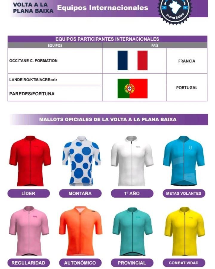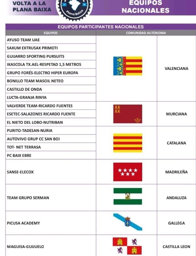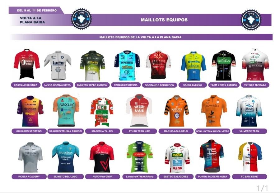 La Volta a la Plana Baixa para corredores júniors, que volverá a disputarse los días 9, 10 y 11 de febrero de 2024 de la mano de Cicloclinic CC y TBG La Plana, contará con 19 equipos nacionales y tres internacionales. De la Comunidad Valenciana acuden ocho: Ayuso Team UAE, Saxum Extrusax Primoti, Guijarro Sporting Pursuits, Ikascola AEL Amiñur, Electro Hiper Europa, Bonillo Team, Castillo de Onda y Lucta-Granja Rinya.