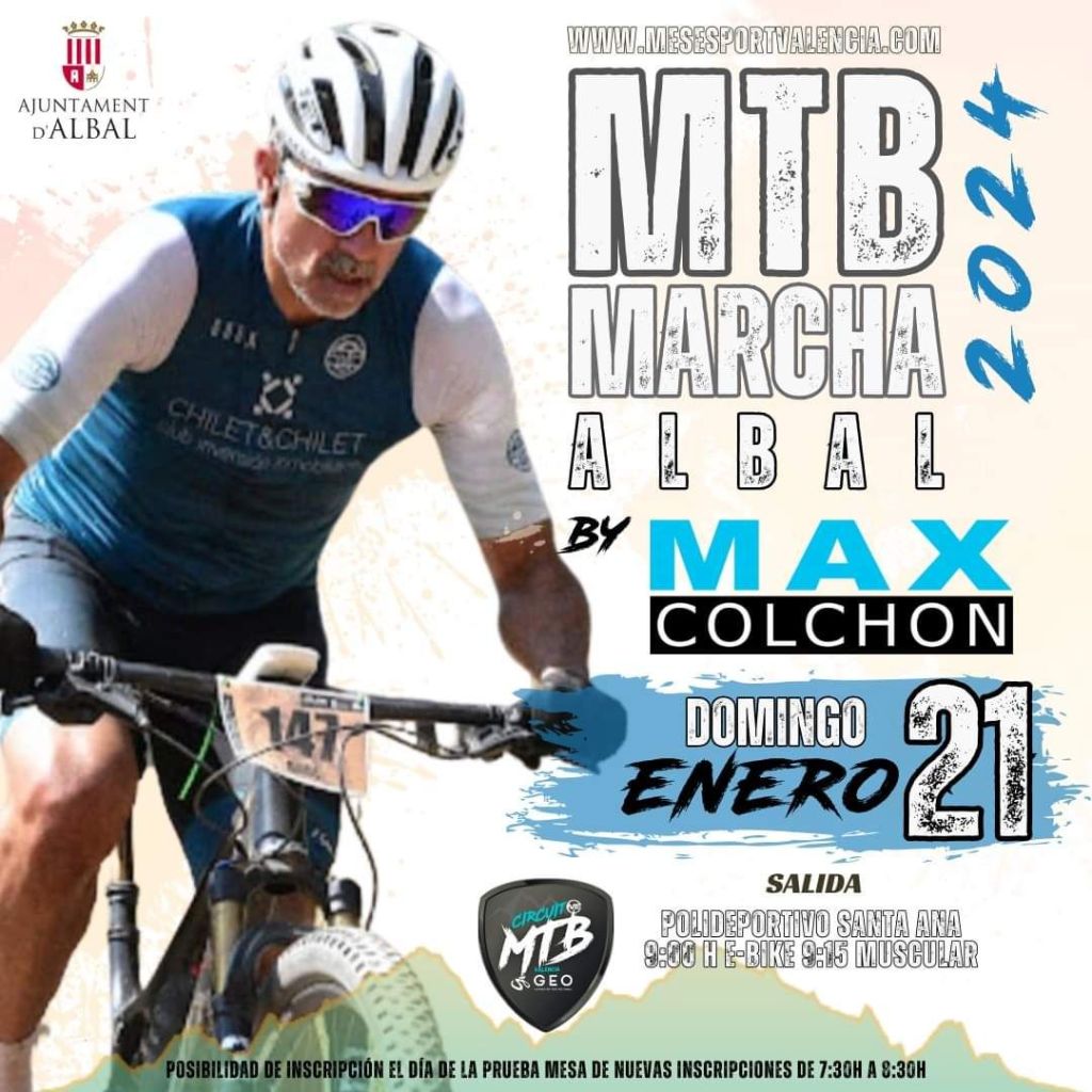 La MTB Marcha Albal ya está ahí. El Club BTT Albal ha organizado, junto a Mesesport València y el Ayuntamiento de Albal, la primera carrera de montaña en su localidad, patrocinada por Max Colchón, Consum y Comerco. La carrera tendrá lugar el domingo día 21 de enero desde el Polideportivo Santa Ana. A las 9 horas partirá la categoría E-Bike y a las 9.15 horas el resto. Pertenece al Circuito de MTB de la provincia de València.