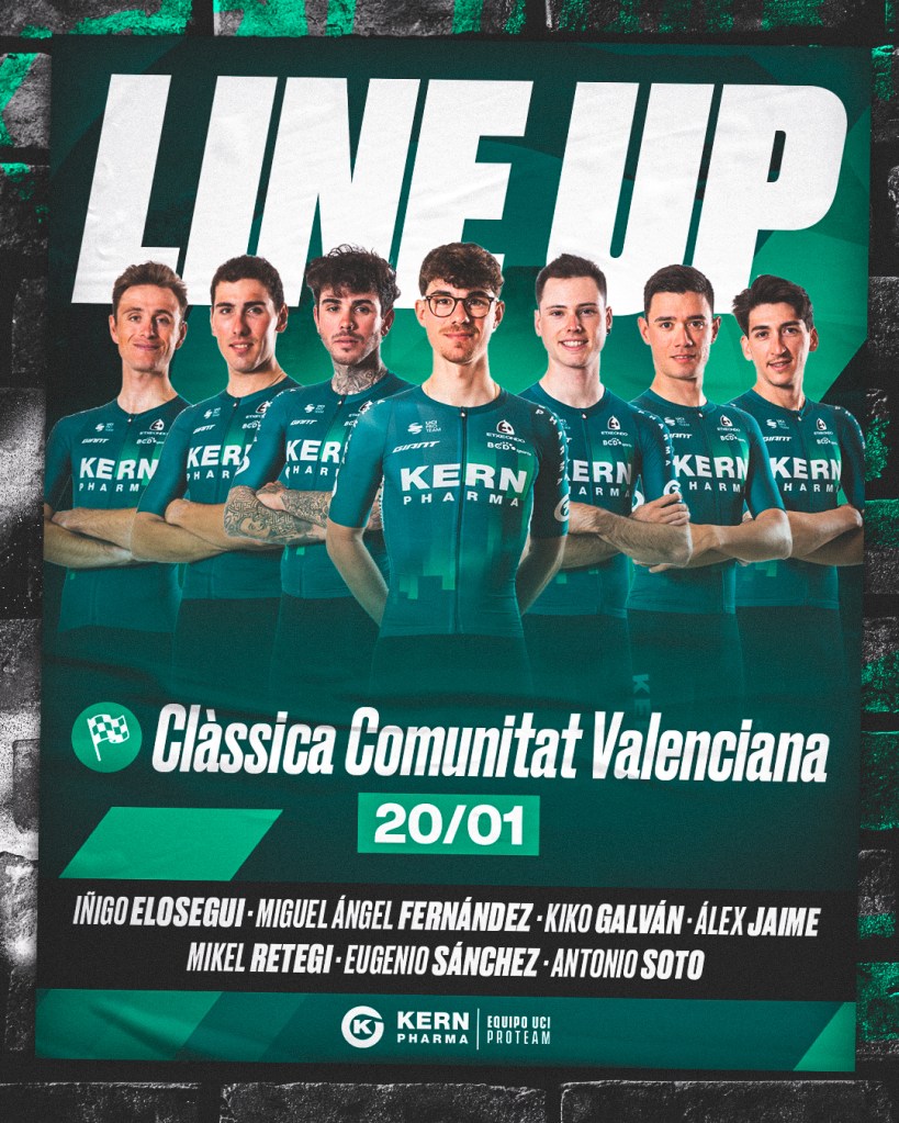 La Clàssica Comunitat Valenciana 1969 – GP València (España, UCI 1.1, 20/01) y el GP Castellón – Ruta de la Cerámica (España, UCI 1.1, 21/01) serán las primeras carreras que disputará el Equipo Kern Pharma en 2024. En la primera, que se disputa el sábado, Eugenio Sánchez se pondrá el dorsal para afrontar de salida el Coll de Rates (14,2km al 4,6%), aunque tras un recorrido de gran fondo (200km) el final será previsiblemente al sprint. Miguel Ángel Fernández, en su debut con el Equipo Kern Pharma, será la gran baza este sábado ayudado por sus compañeros.