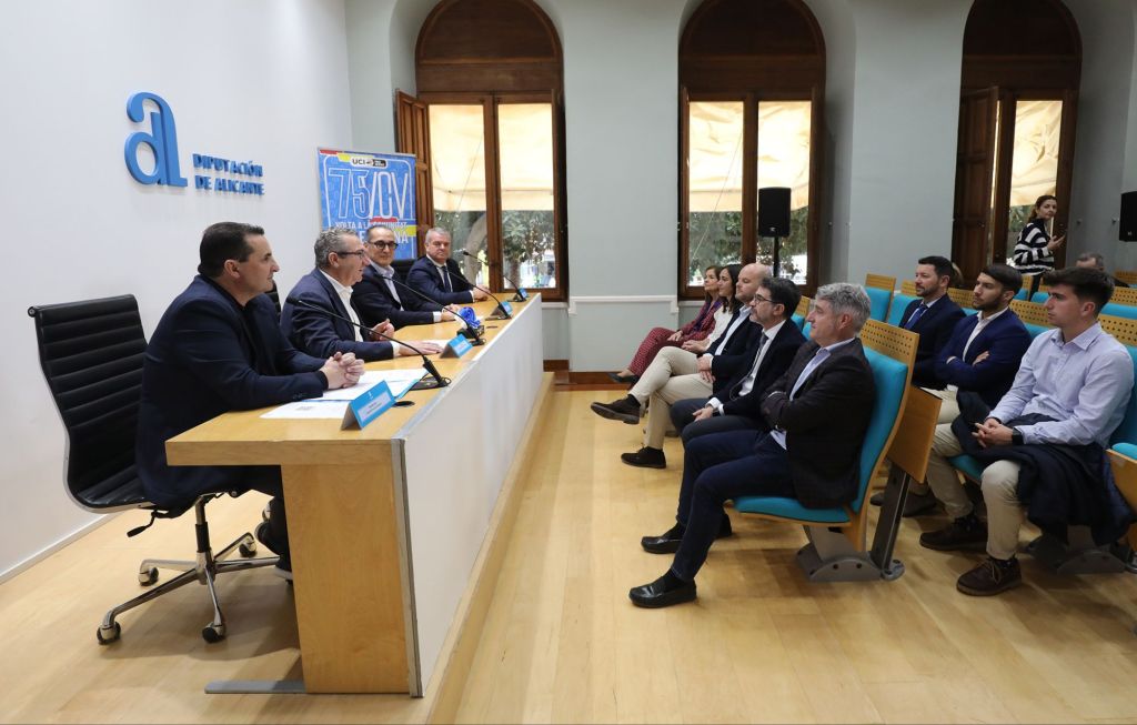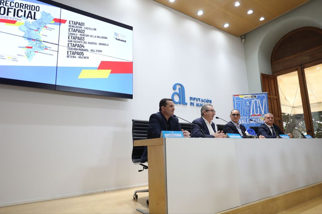 La Volta Ciclista a la Comunitat Valenciana recala un año más en la provincia de Alicante, en esta ocasión, con dos etapas estelares que se disputarán los días 2 y 3 de febrero. El presidente de la Diputación, Toni Pérez, el diputado de Deportes, Bernabé Cano, y el director general del evento, Ángel Casero, han presentado esta mañana todos los detalles de esta competición que, en su 75ª edición, contará con la presencia de más de 130 corredores y 19 equipos de todo el mundo -7 World Team, 9 Pro Team y 3 Continental Team-.
